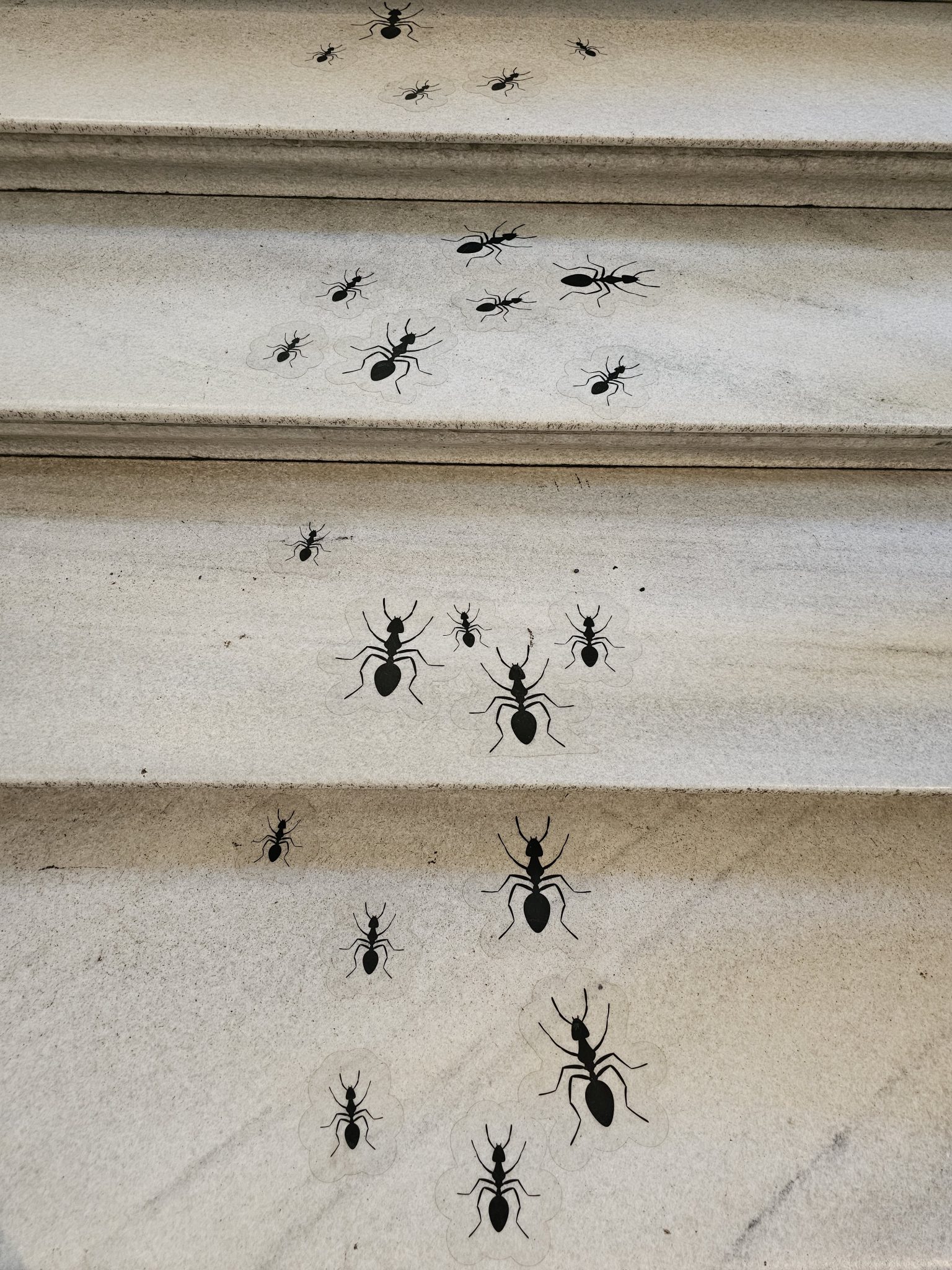 Alternative Text: A staircase with black ant stickers placed on the steps, creating an illusion of ants marching upwards. The ants vary in size, with larger ants near the bottom of the stairs and smaller ones towards the top, enhancing the perspective effect.
