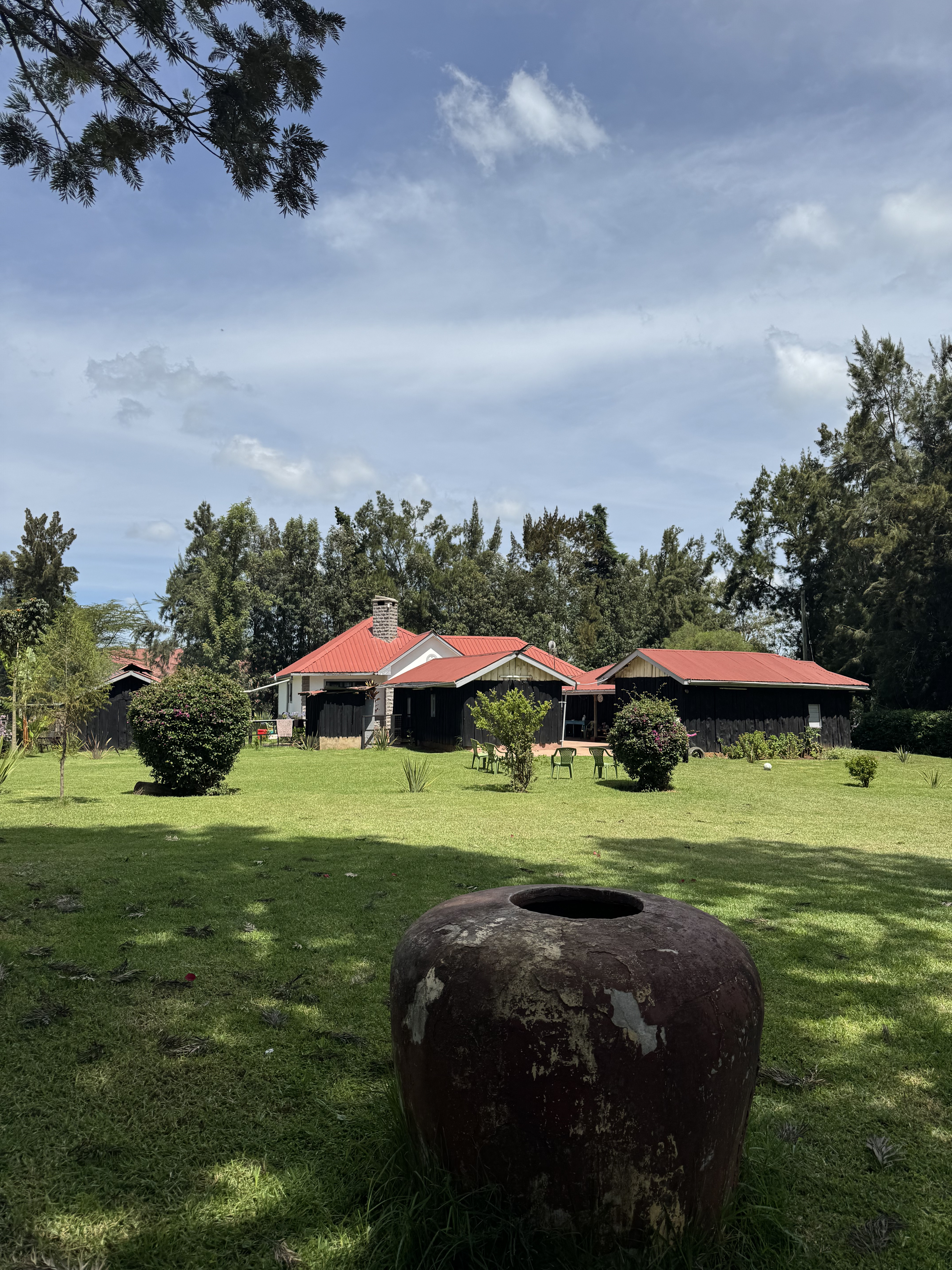 Alternative Text: A photo of a house with a red roof, surrounded by green grass and trees under a partly cloudy sky. In the foreground is a large, weathered, brown ceramic pot