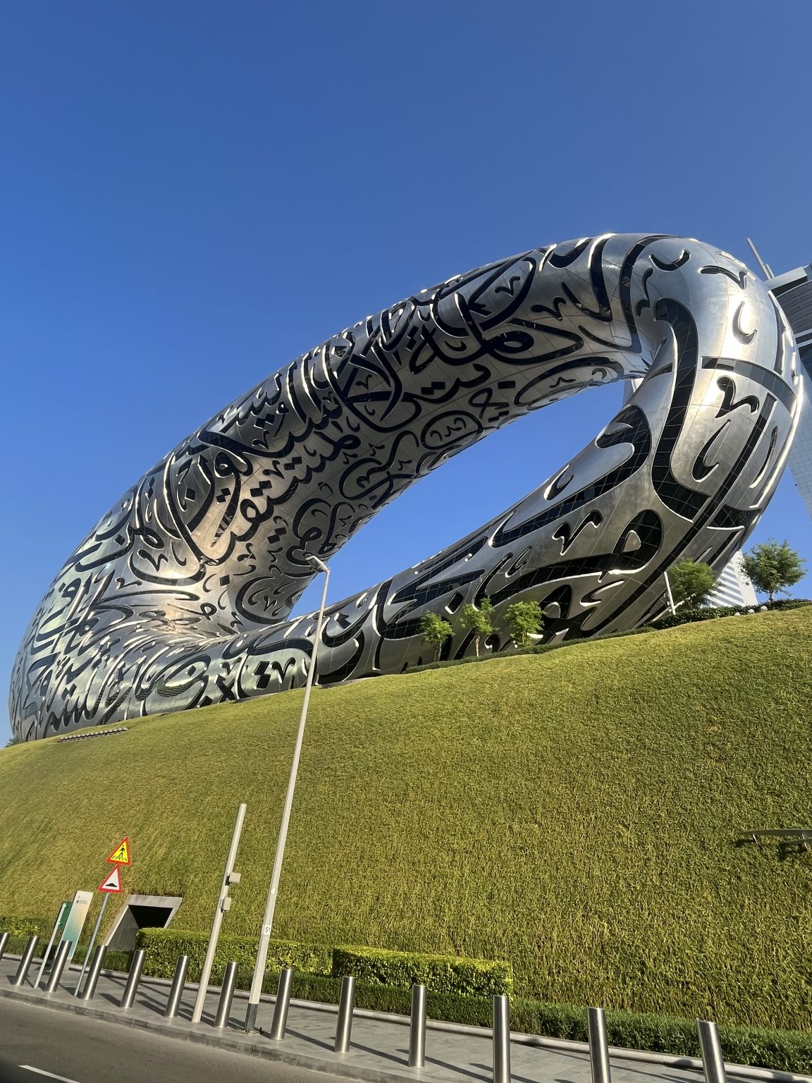 Alternative Text: Silver, hollow, ring-shaped building covered in black Arabic calligraphy, rising from green grass against a blue sky.