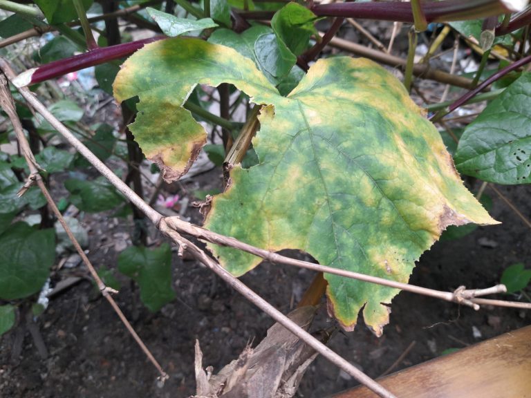 Alternative Text: A close-up of a large leaf showing signs of damage and discoloration.