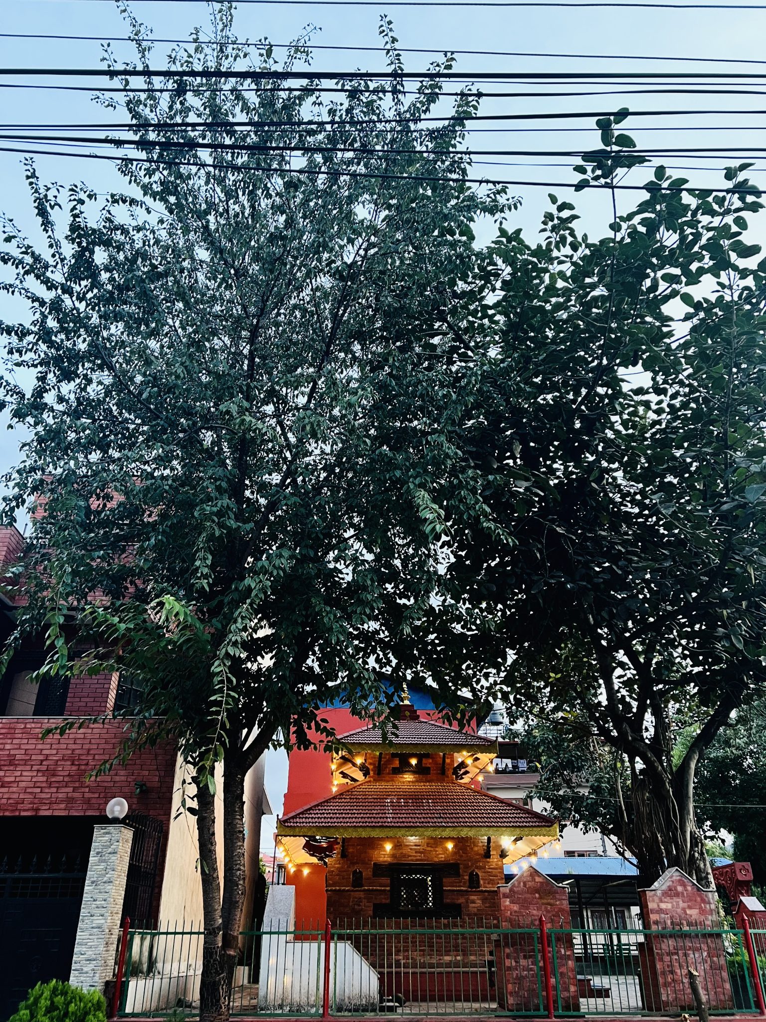 Alternative Text: A small, ornate red and brown temple stands between two large trees. The temple’s roof is decorated with a red top and it is surrounded by a low brick wall and a fence
