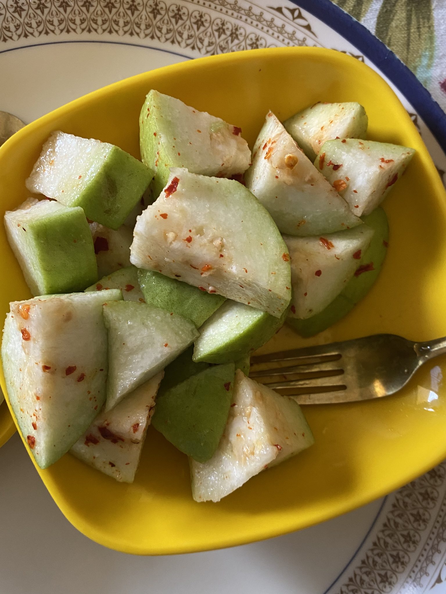 Alternative Text: Green guava slices with red chili flakes in a bright yellow bowl.
