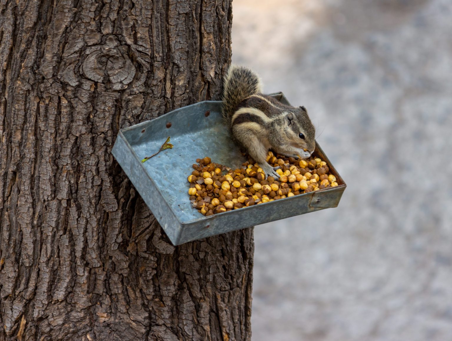 Alternative Text: Squirrel eating food from a tray hanging on a tree trunk.