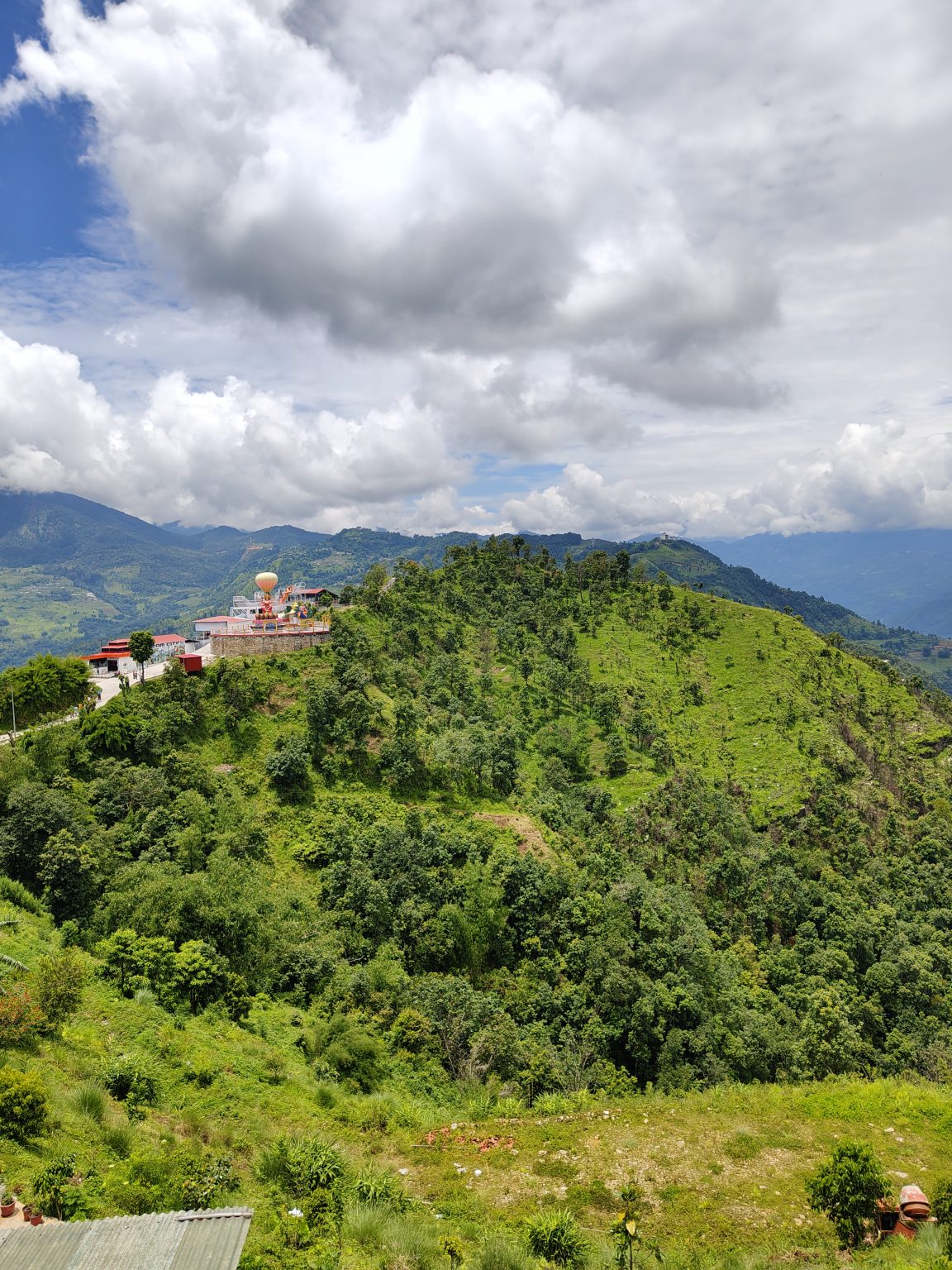 Alternative Text: A panoramic view of a lush green hillside with a temple complex situated at the top.