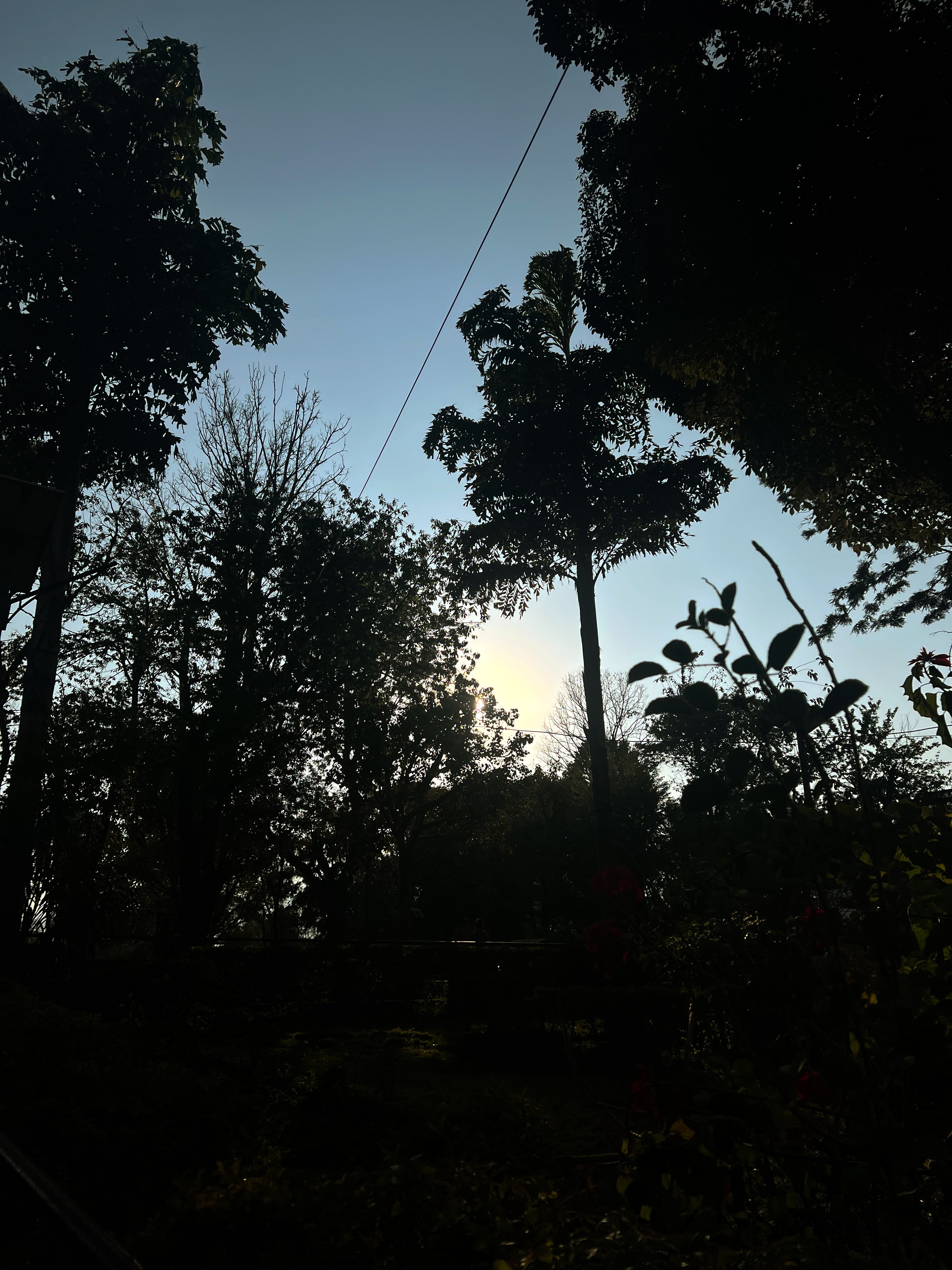 Alternative Text: A dark silhouette of tall trees against a bright, hazy sun low in the sky.