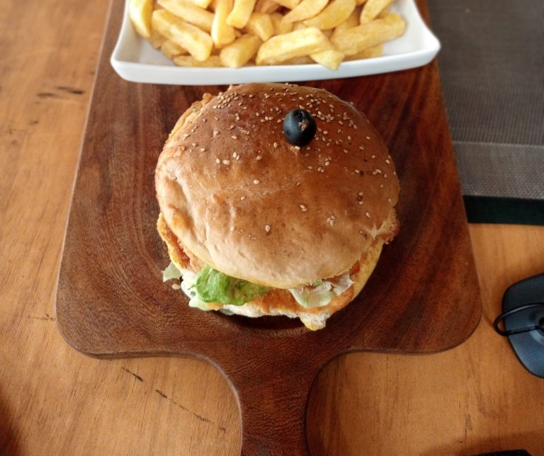 Alternative Text: A chicken burger with lettuce on a sesame bun topped with a black olive, served on a wooden board with chips in the background.