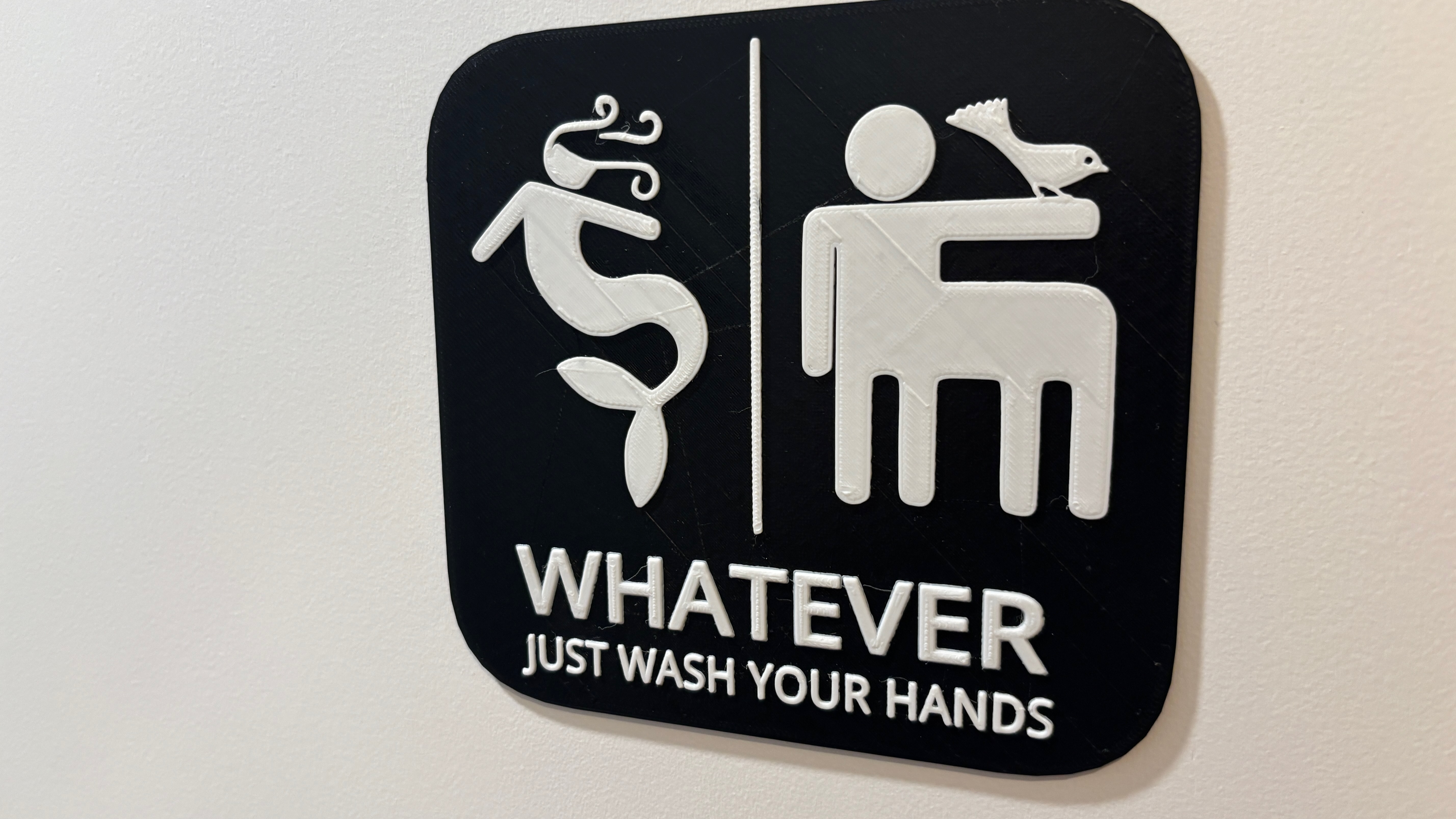 Alternative Text: A bathroom gender sign, but it’s a mermaid on one side, and a centaur with a bird on his arm on the other, and it says “Whatever, just wash your hands”
