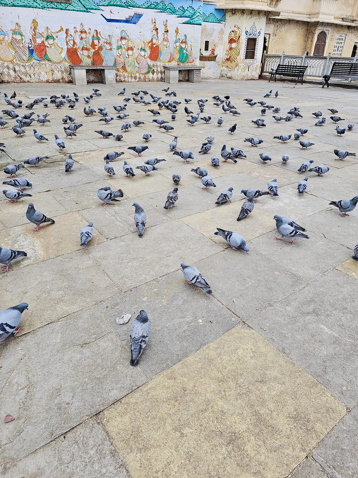 Alternative Text: A large flock of pigeons gathers on a stone courtyard in Udaipur, with a vibrant mural of figures painted on the wall of a building in the background.