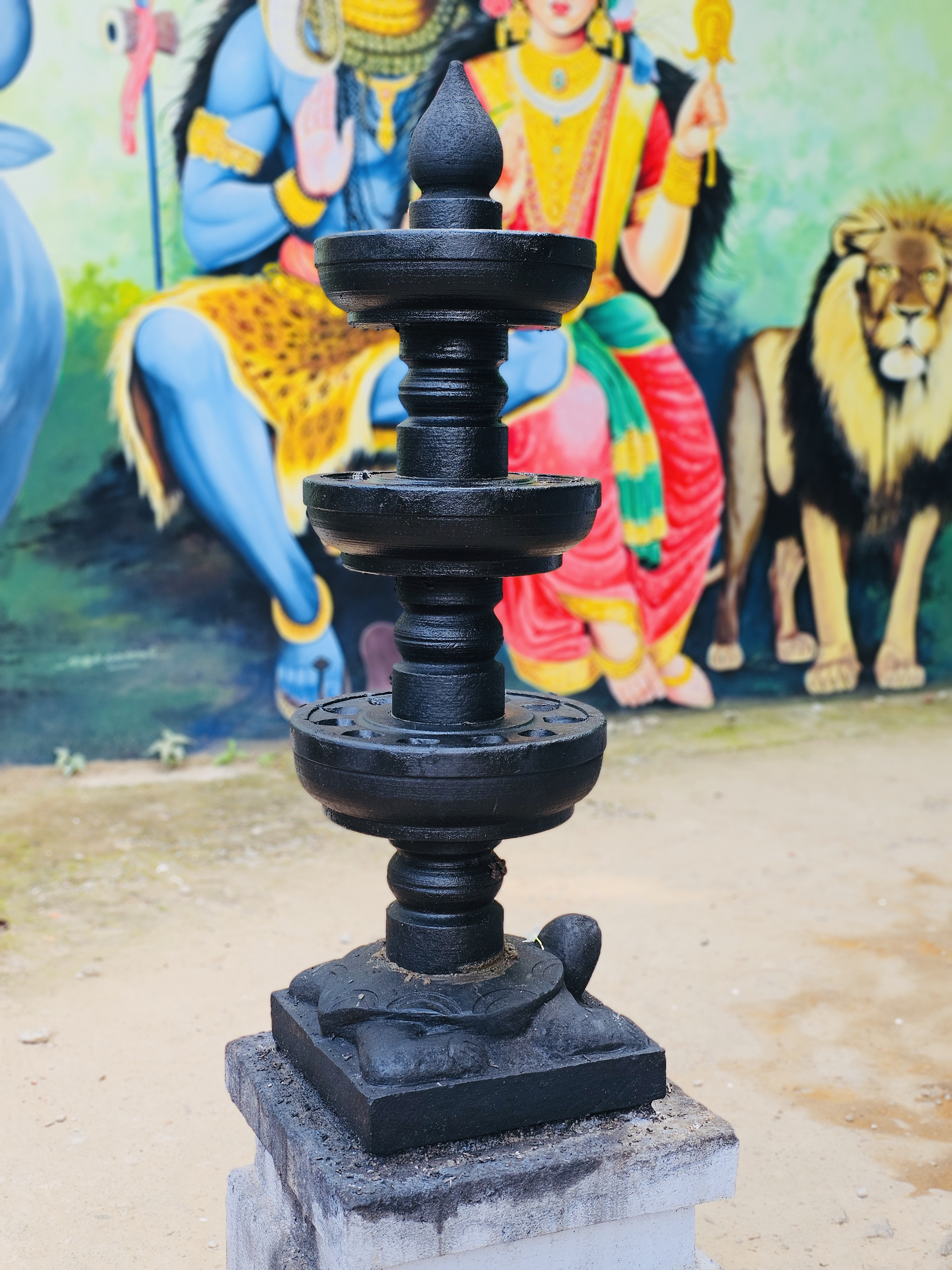 Alternative Text: A black stone temple lamp stands in front of a colorful Hindu mural depicting deities. The contrast of stone and paint highlights the spiritual art traditions of Kozhikode, Kerala.
