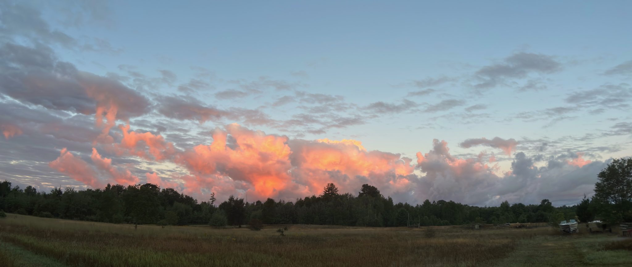 Alternative Text: Crepuscular sun lighting puffy clouds with orange light over a green field.