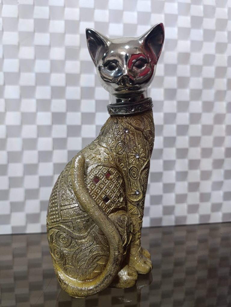 Alternative Text: A cat sculpture with a silver head and a golden body, decorated with extravagant patterns and shiny stones.