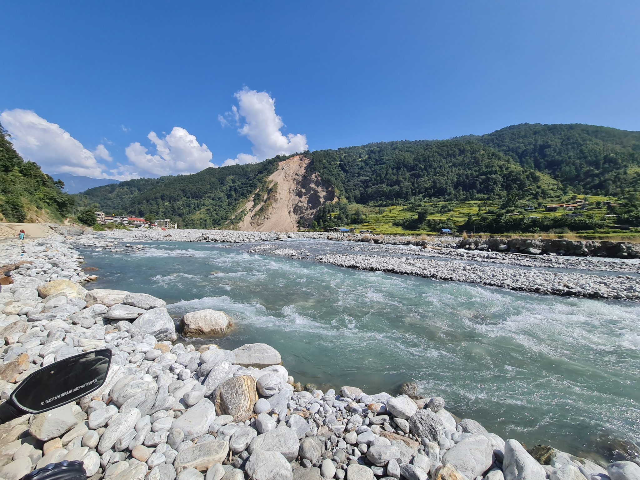 Alternative Text: Flowing river with rocky banks in a valley between hills
