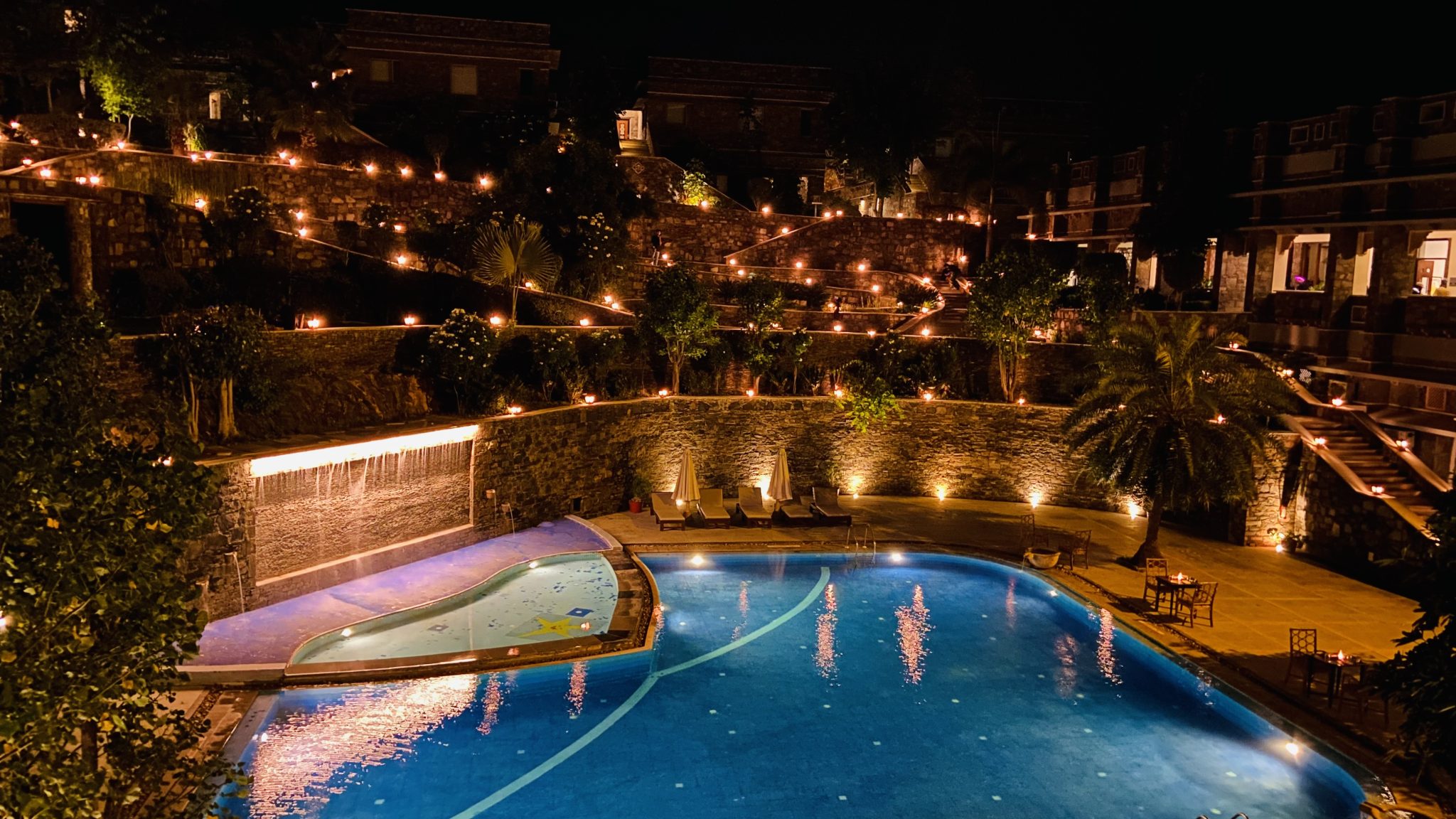 Alternative Text: A peaceful nighttime poolside scene with rich greenery and subtle lighting enhancing the natural beauty.