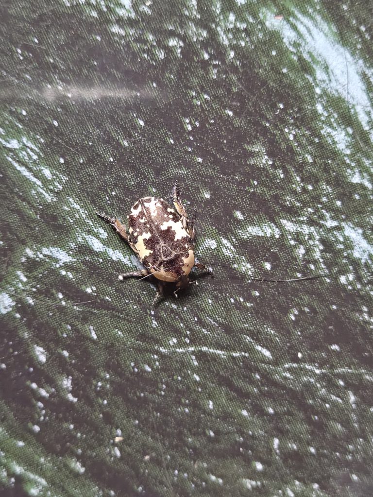 Alternative Text: A close-up image of a small beetle with a patterned shell featuring black and white spots, resting on a textured green surface.