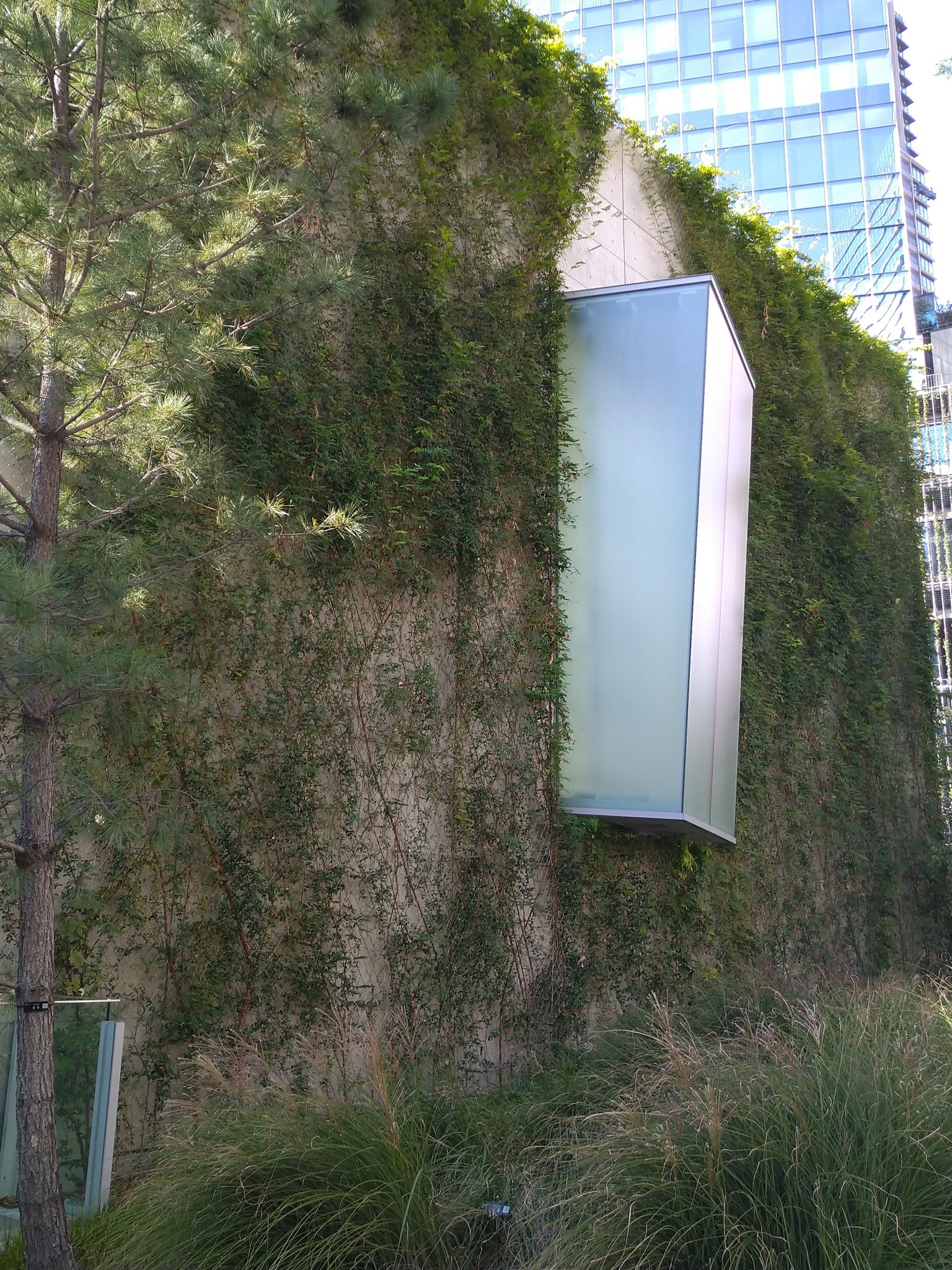 Alternative Text: A modern, partially covered building facade is adorned with lush green vegetation, featuring a large, frosted glass box protruding from the wall.