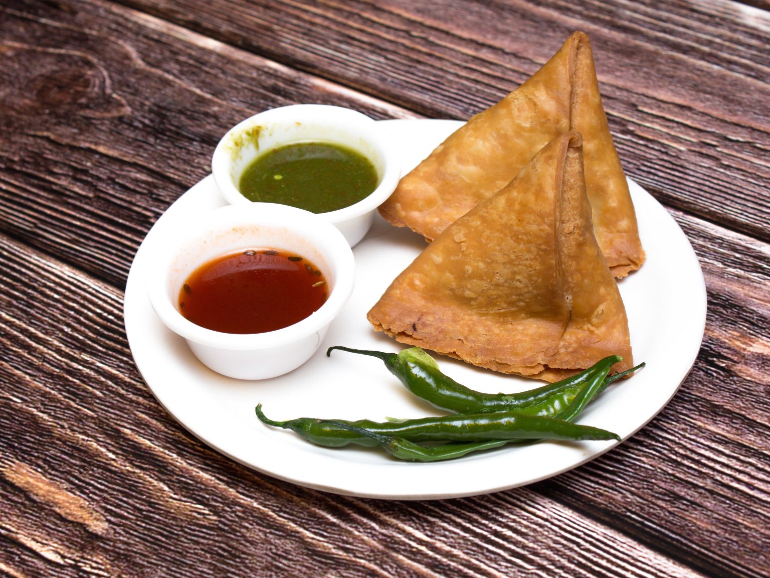 Alternative Text: Two crispy golden samosas served on a white plate with green chilies and two small bowls of green chutney and red tamarind sauce, placed on a wooden table.