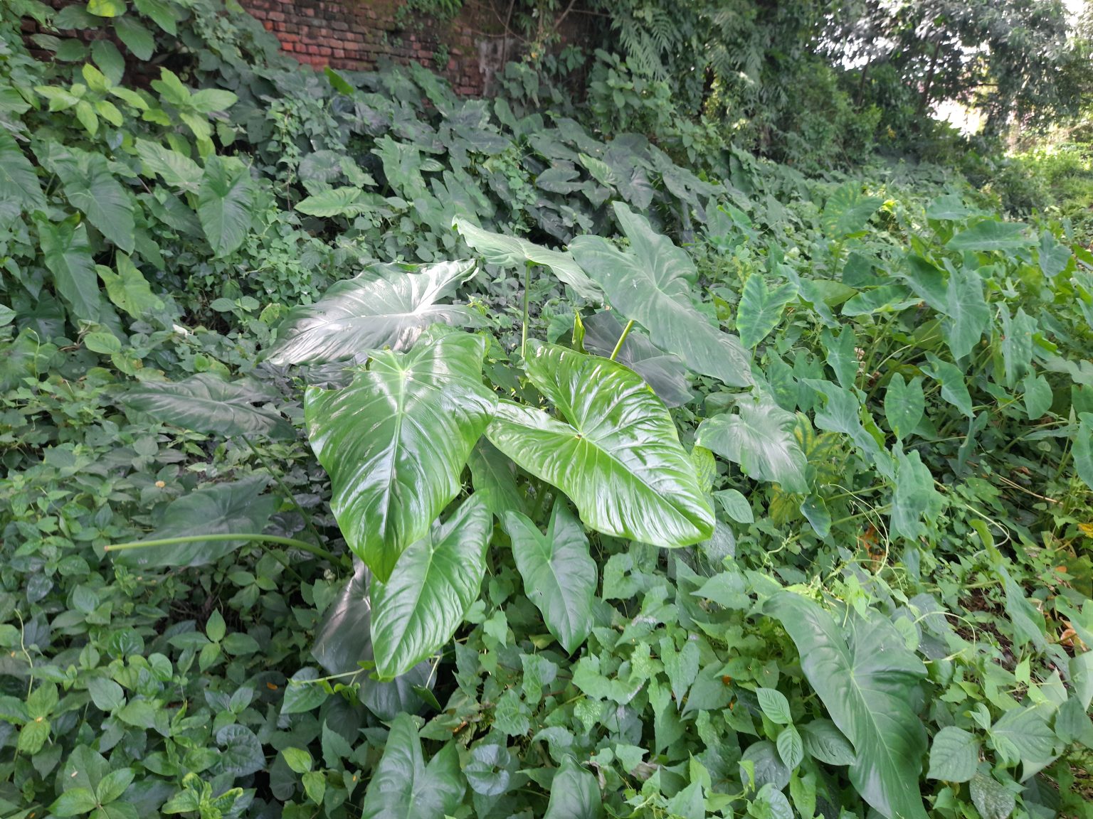 Alternative Text: A dense area of green foliage with large, glossy leaves, surrounded by smaller plants and creeping vines.