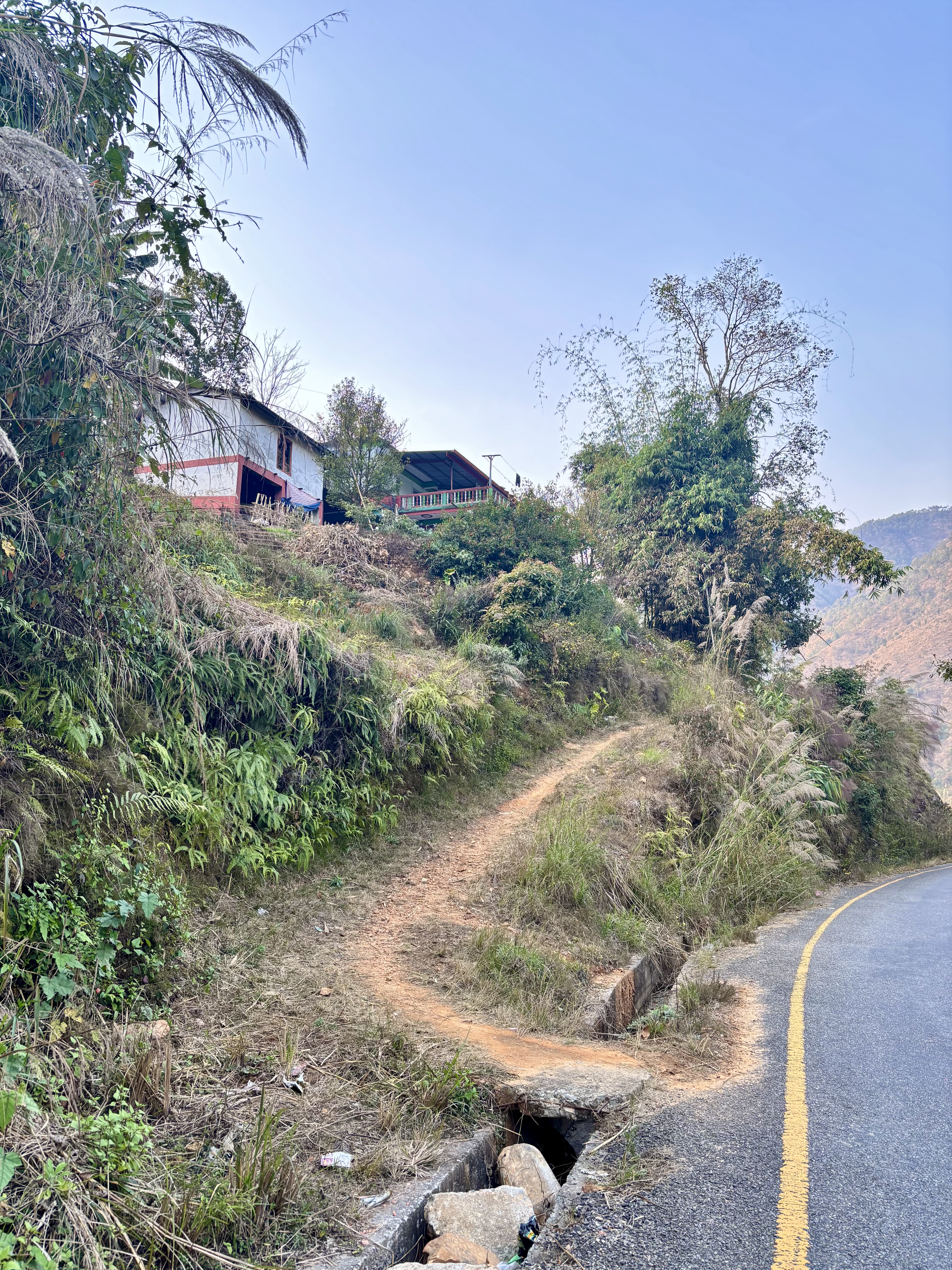 Alternative Text: A winding dirt path leads up a hillside, flanked by lush greenery and grass