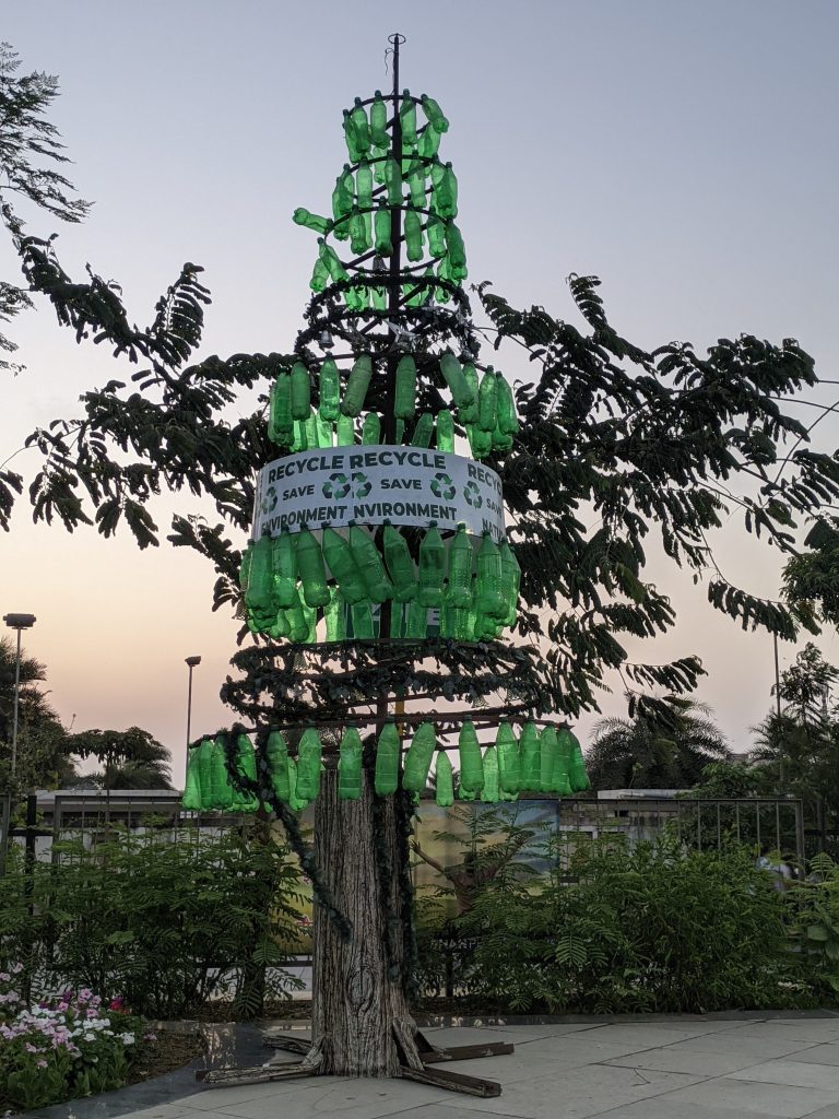 Alternative Text: Tree made from recycled plastic bottles with eco message