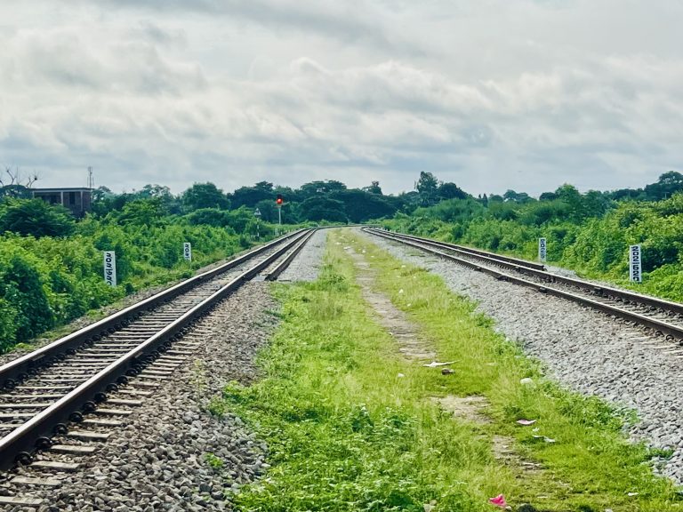 Alternative Text: A view of two parallel railway tracks diverging in the distance, surrounded by lush green vegetation and scattered gravel. A small building can be seen on the left, and a red signal light is positioned near the tracks. The sky is partly cloudy, contributing to the overall natural landscape.