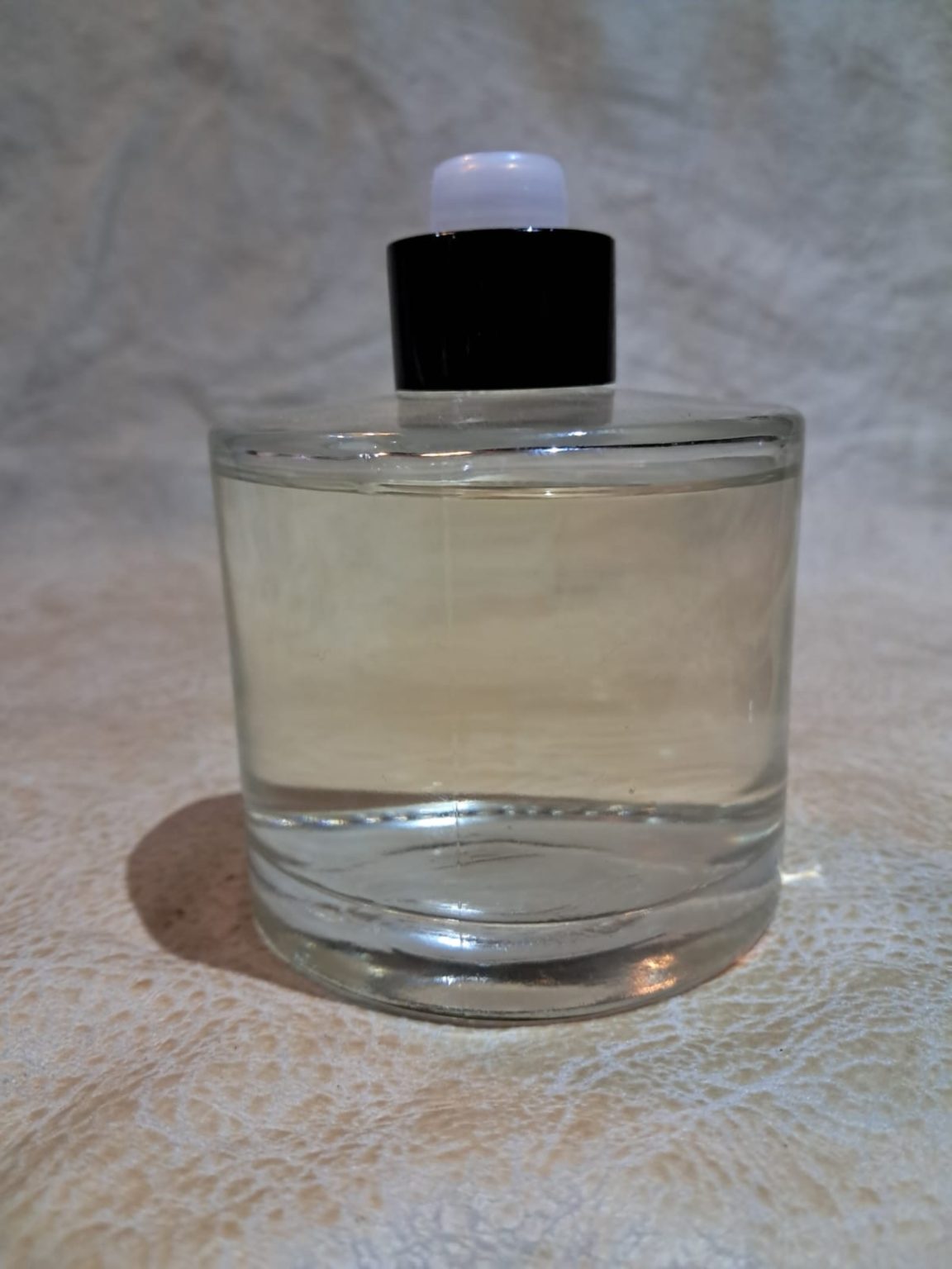 Alternative Text: A clear glass bottle partially filled with liquid, featuring a black cap and a white nozzle, placed on a textured beige surface.
