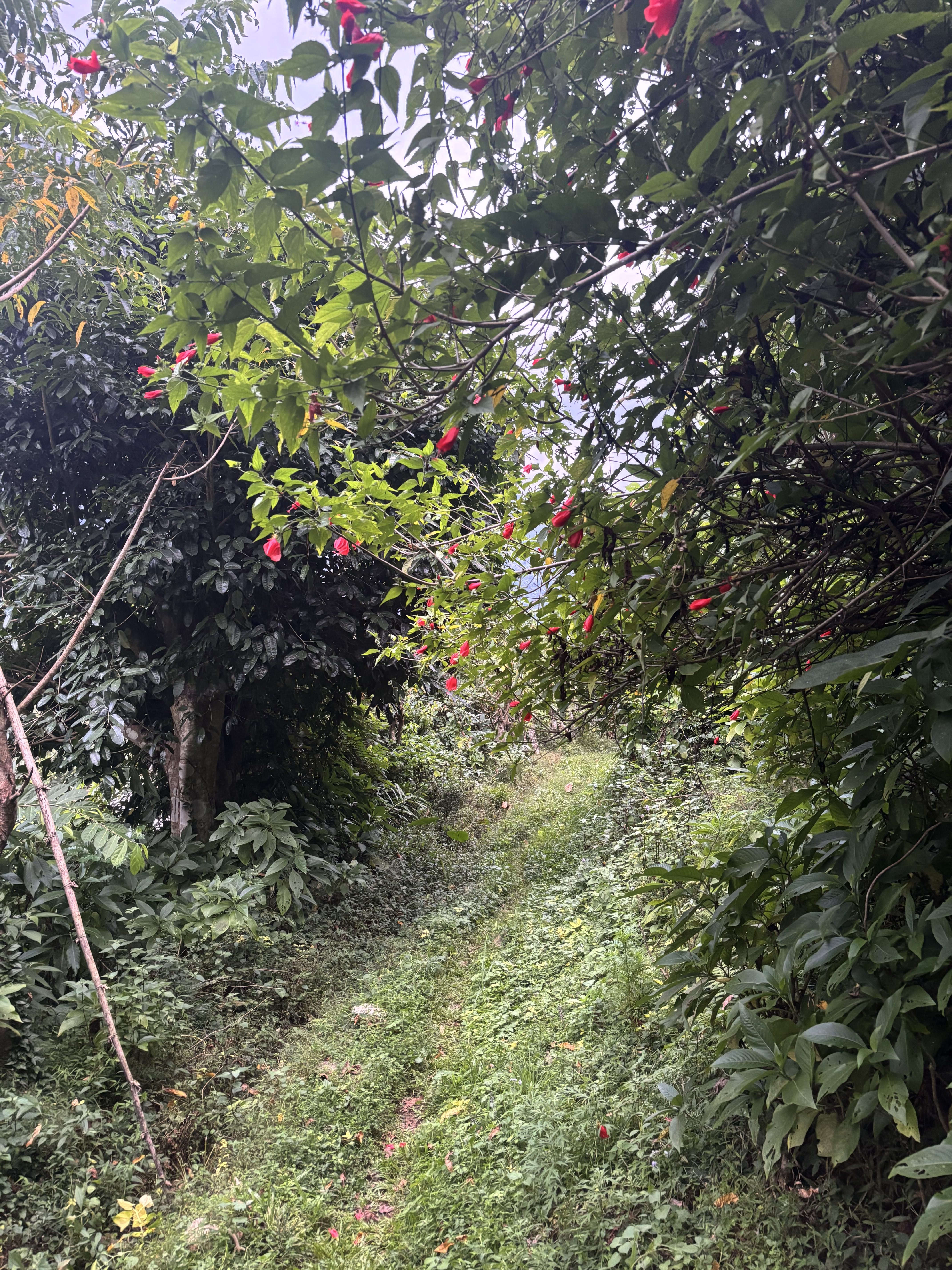 Alternative Text: A narrow path winding through lush greenery, flanked by dense bushes and trees with vibrant red flowers.