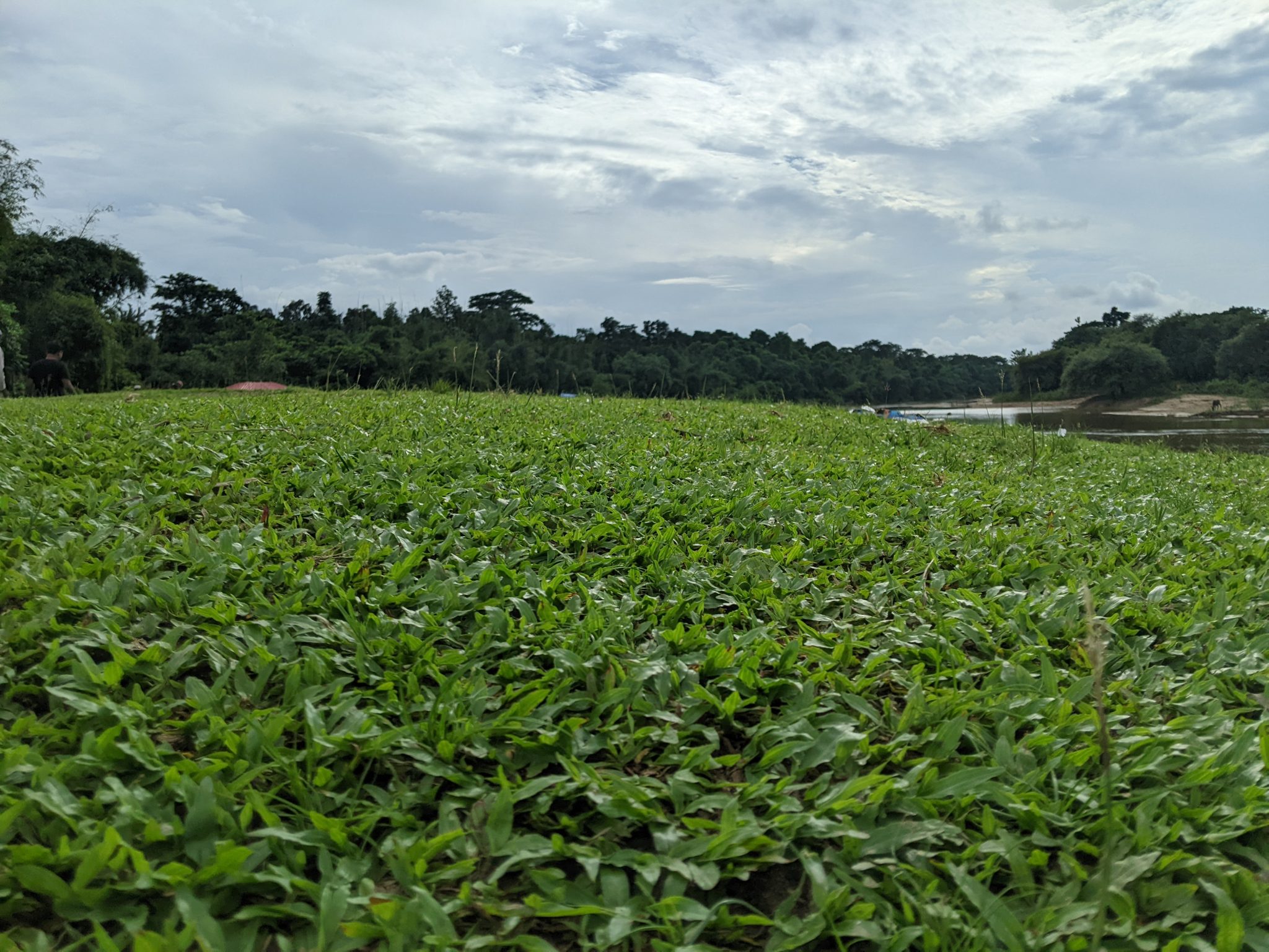 Alternative Text: A low-angle view of lush, dense green grass extending to a treeline under a bright, cloudy sky