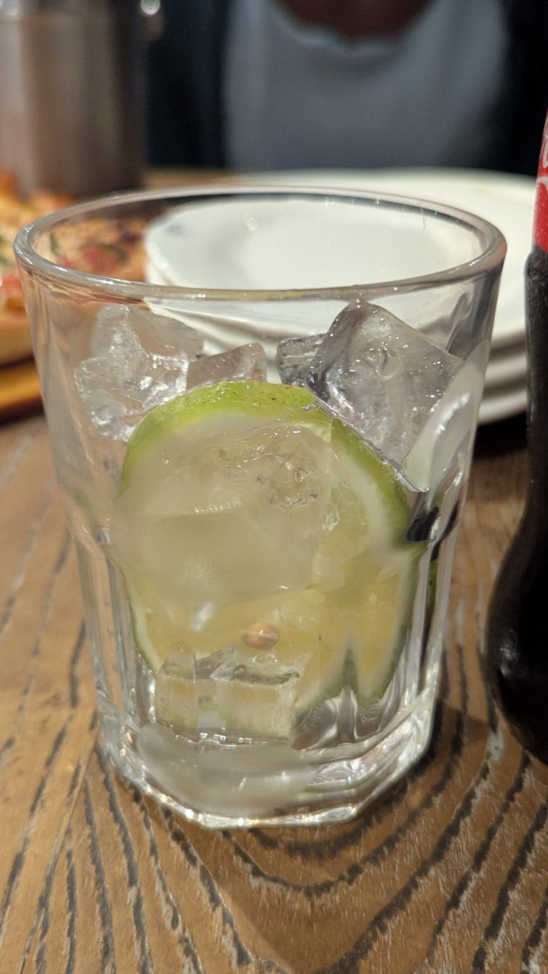 Alternative Text: Empty glass with lemon slice and ice cubes