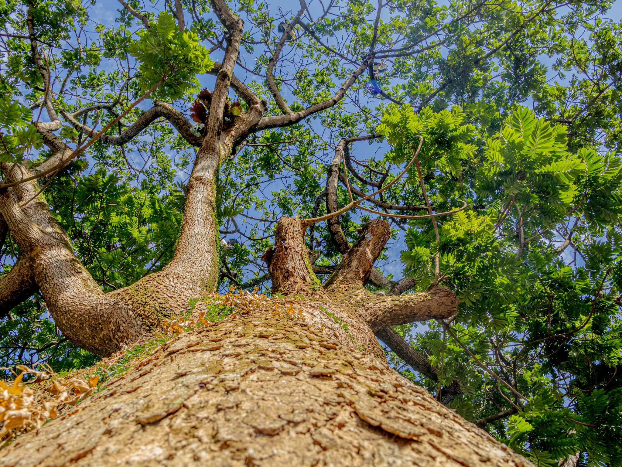 Alternative Text: A low-angle view of a tall tree, showcasing its textured bark and wide branches adorned with vibrant green leaves.