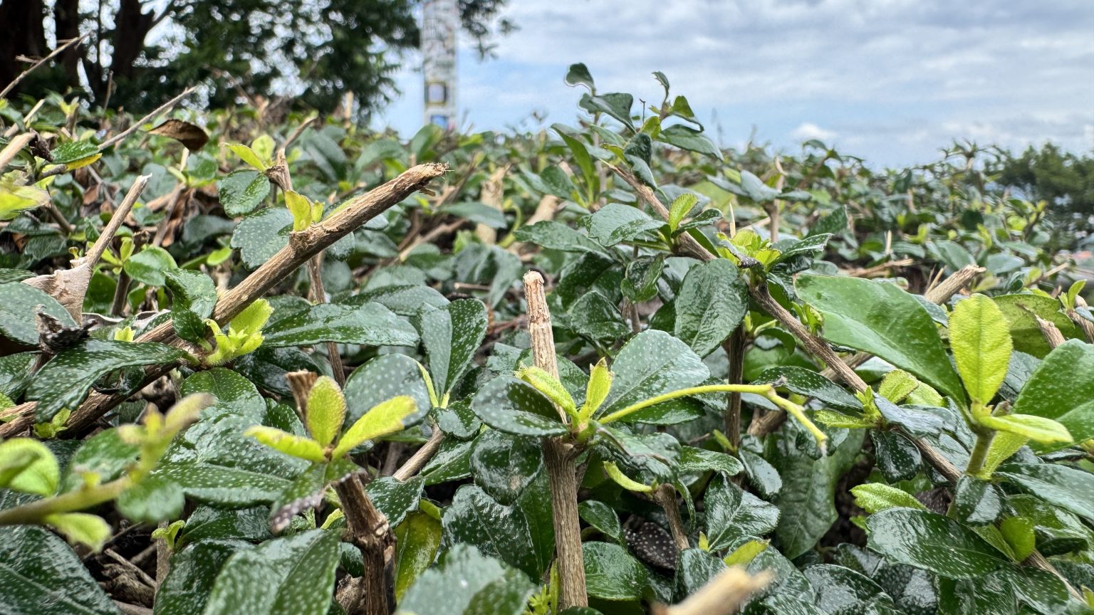 Alternative Text: A close-up of a neatly trimmed green shrub showing new growth and textured leaves against a cloudy coastal sky.