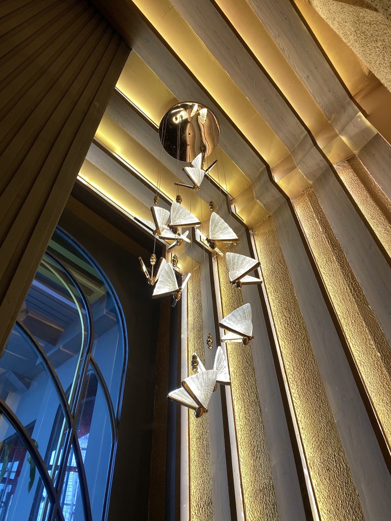 Alternative Text: Elegant chandelier with triangular glass pendants hangs against a textured wall. Warm, ambient lighting creates a sophisticated, modern atmosphere.