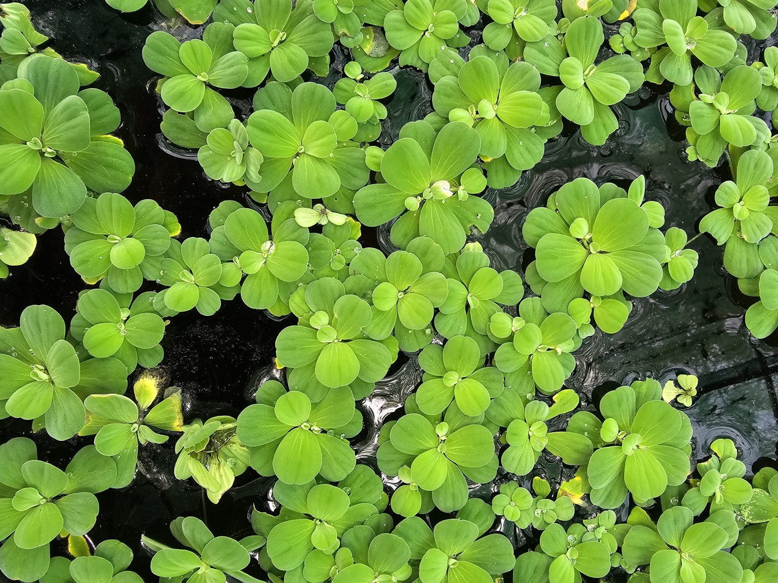 Alternative Text: A dense mat of bright-green water lettuce (Pistia stratiotes) floats on dark water. These aquatic plants have rosette-shaped leaves and are velvety on the water surface at the Malabar Botanical Garden, Kozhikode.