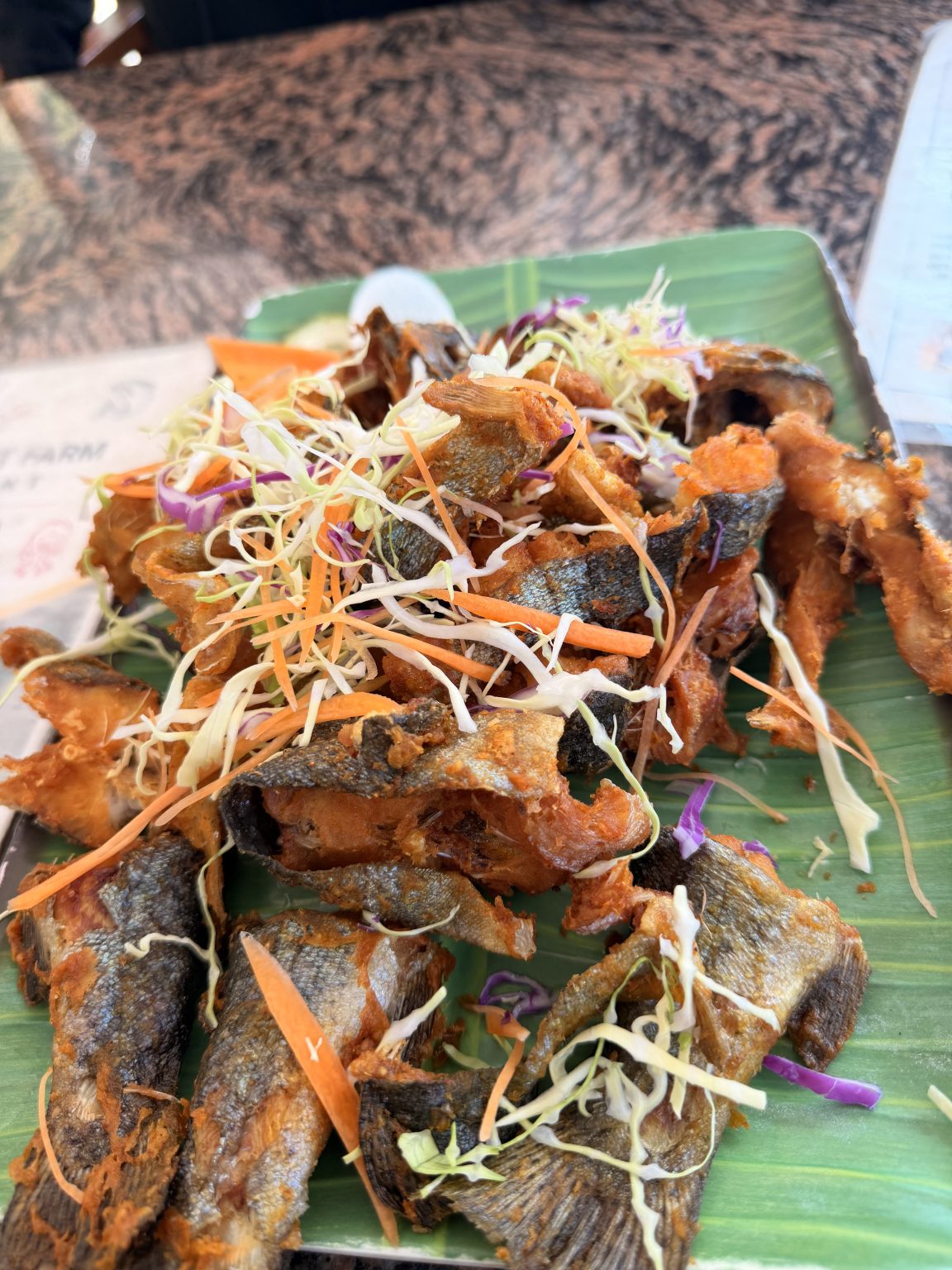 Alternative Text: A plate of crispy fried fish garnished with shredded cabbage and carrot, served on a banana leaf, set on a patterned table surface.