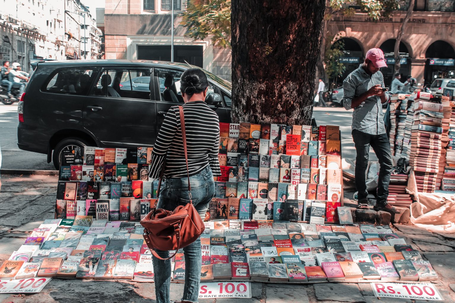 Alternative Text: Image of a roadside bookstall with books and customers browsing them.