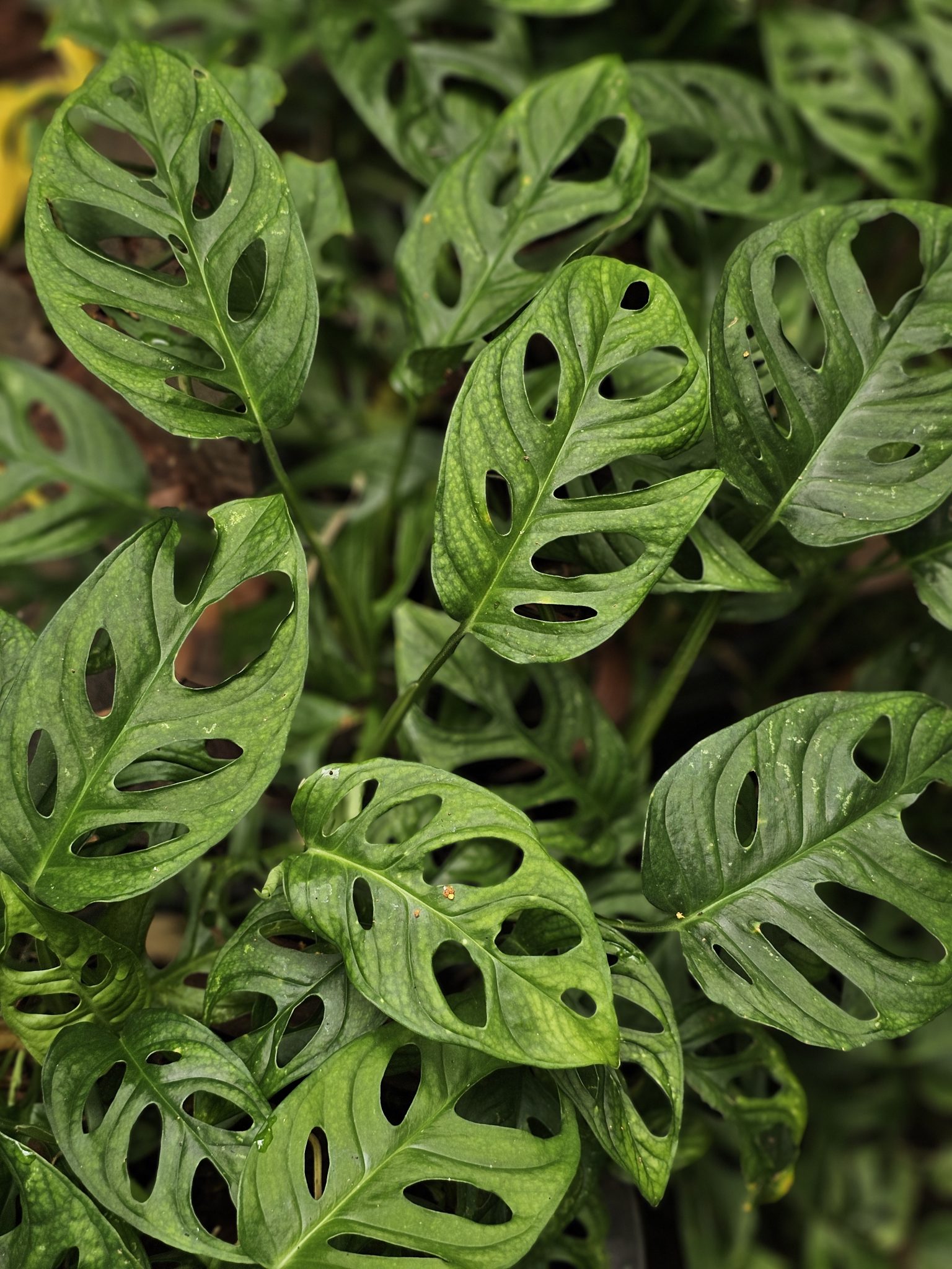 Alternative Text: Beautiful Monstera leaves with natural holes, seen at the Malabar Botanical Garden, Kozhikode. The bright green patterns and unique cutouts make the plant look lively and full of character in the garden’s lush environment.
