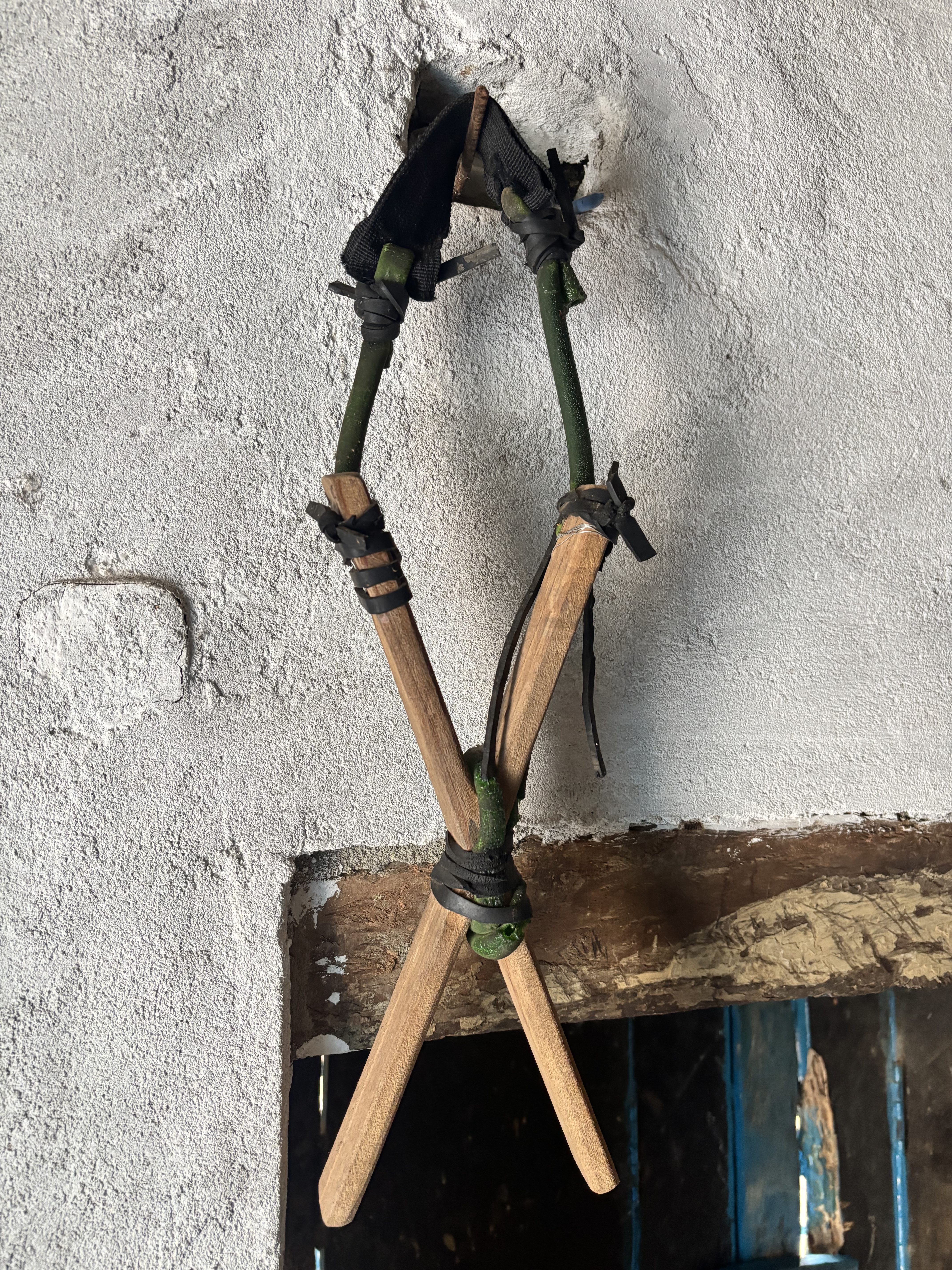 Alternative Text: A slingshot with wooden X-shaped handle and a dark rubber band hangs on a white wall.