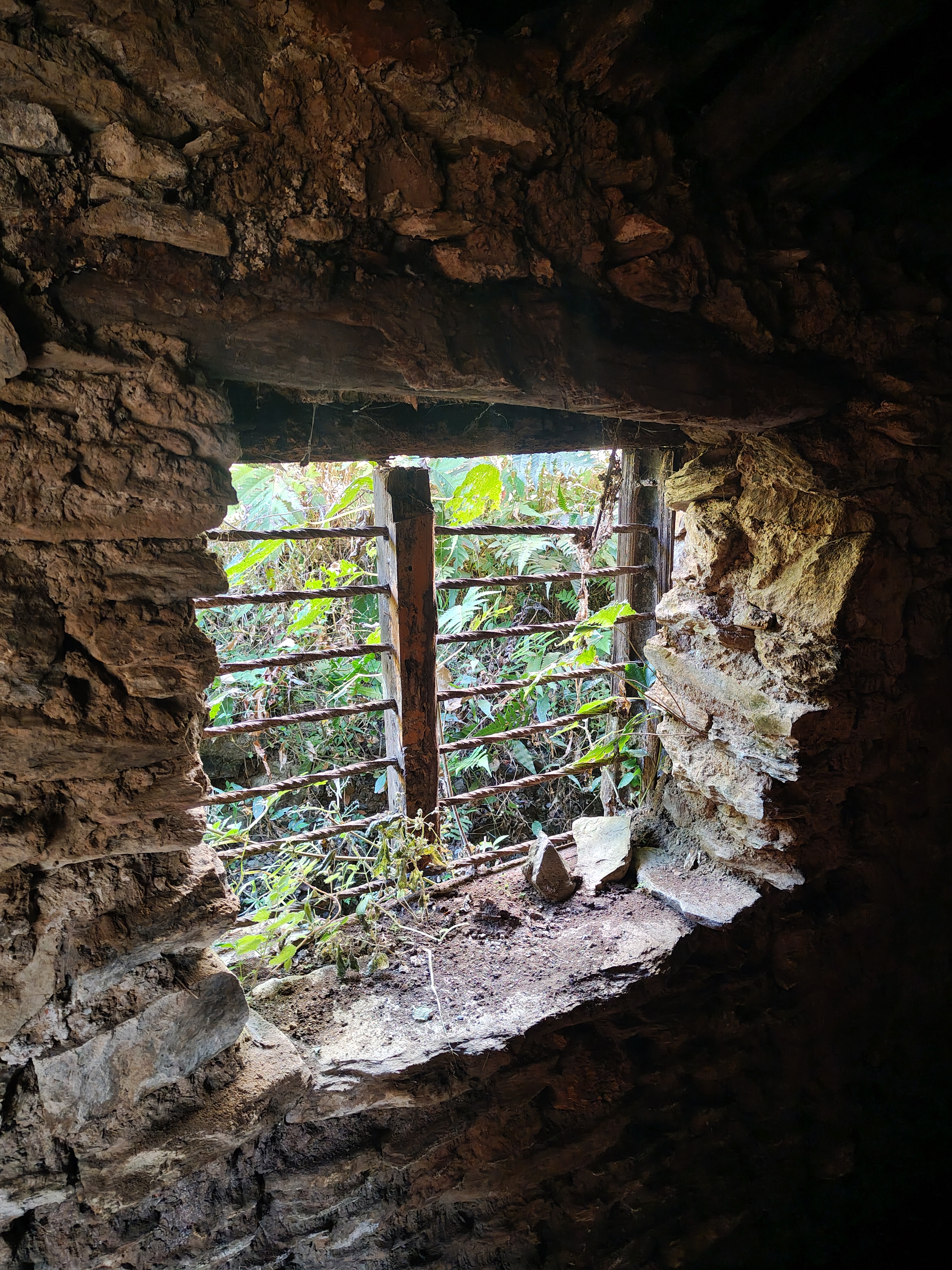Alternative Text: A weathered stone wall featuring an arched window illuminated by natural light.