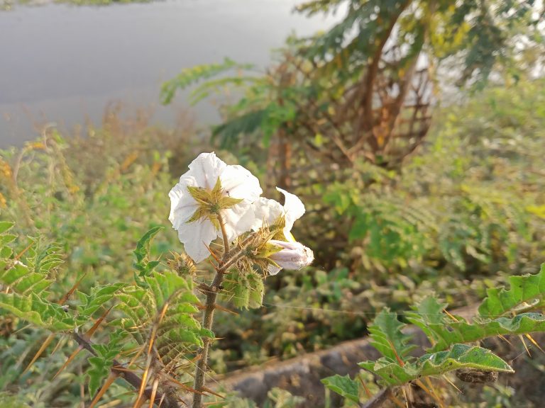 Alternative Text: A close-up of a white flower with a yellow center and green leaves in Kawtoli, Brahmanbaria, Bangladesh.