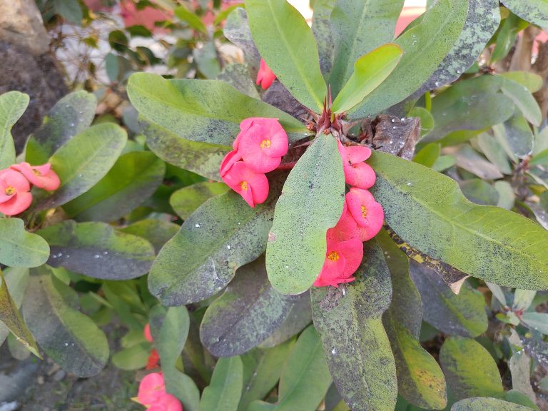 Alternative Text: A close-up of a plant featuring vibrant pink flowers and broad green leaves
