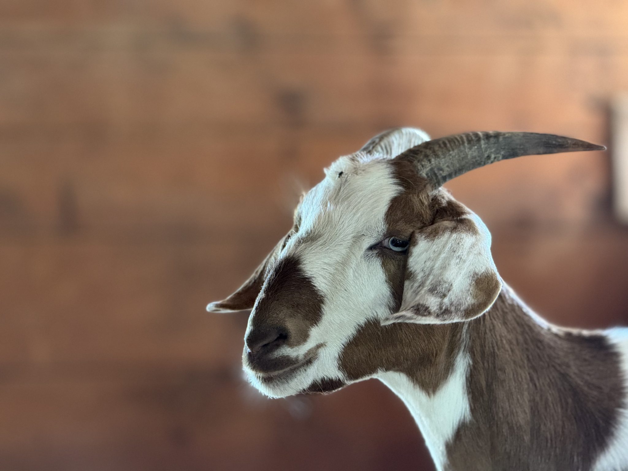 Alternative Text: A close up of a white and brown angora goat with gray eyes and horns in a barn.
