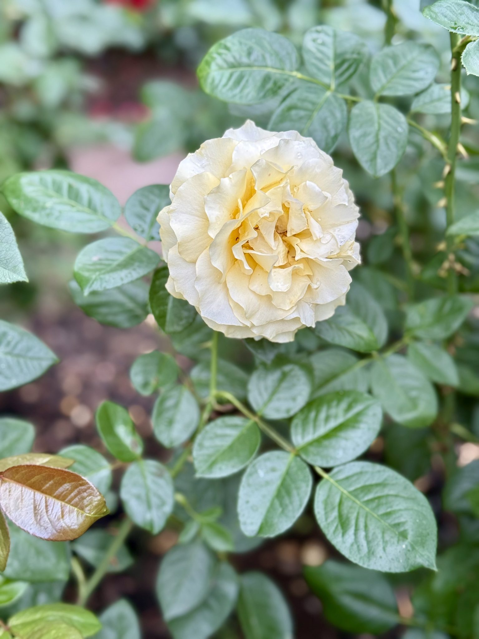 Alternative Text: A soft cream-yellow rose blooms peacefully at the International Rose Test Garden, Portland. Its layered petals and fresh green leaves add a gentle charm.