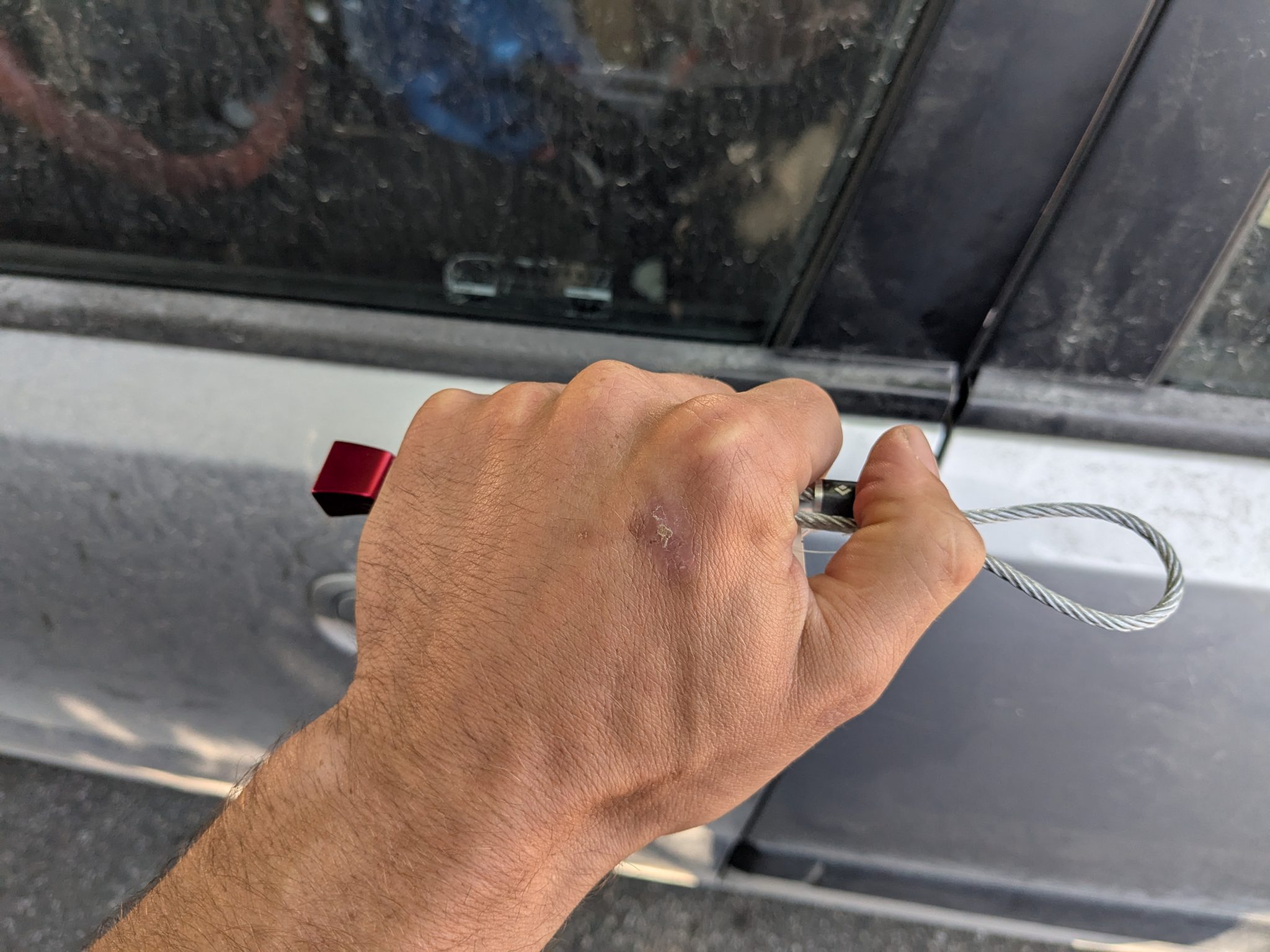 Alternative Text: A hand gripping a small red tool attached to a thin cable, positioned near a car door with a slightly dirty surface.