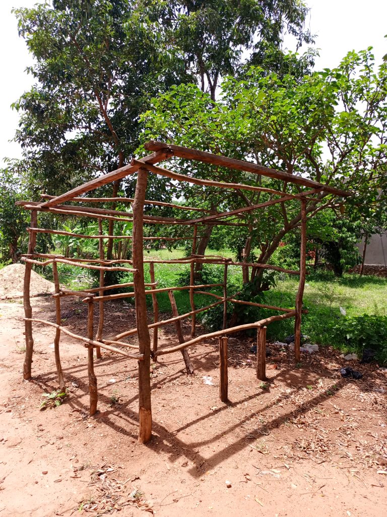 Alternative Text: A small wooden shelter stands on red sandy ground, built from rough poles and branches. It has an open frame with a sloped roof, surrounded by green trees and grass under bright sunlight.