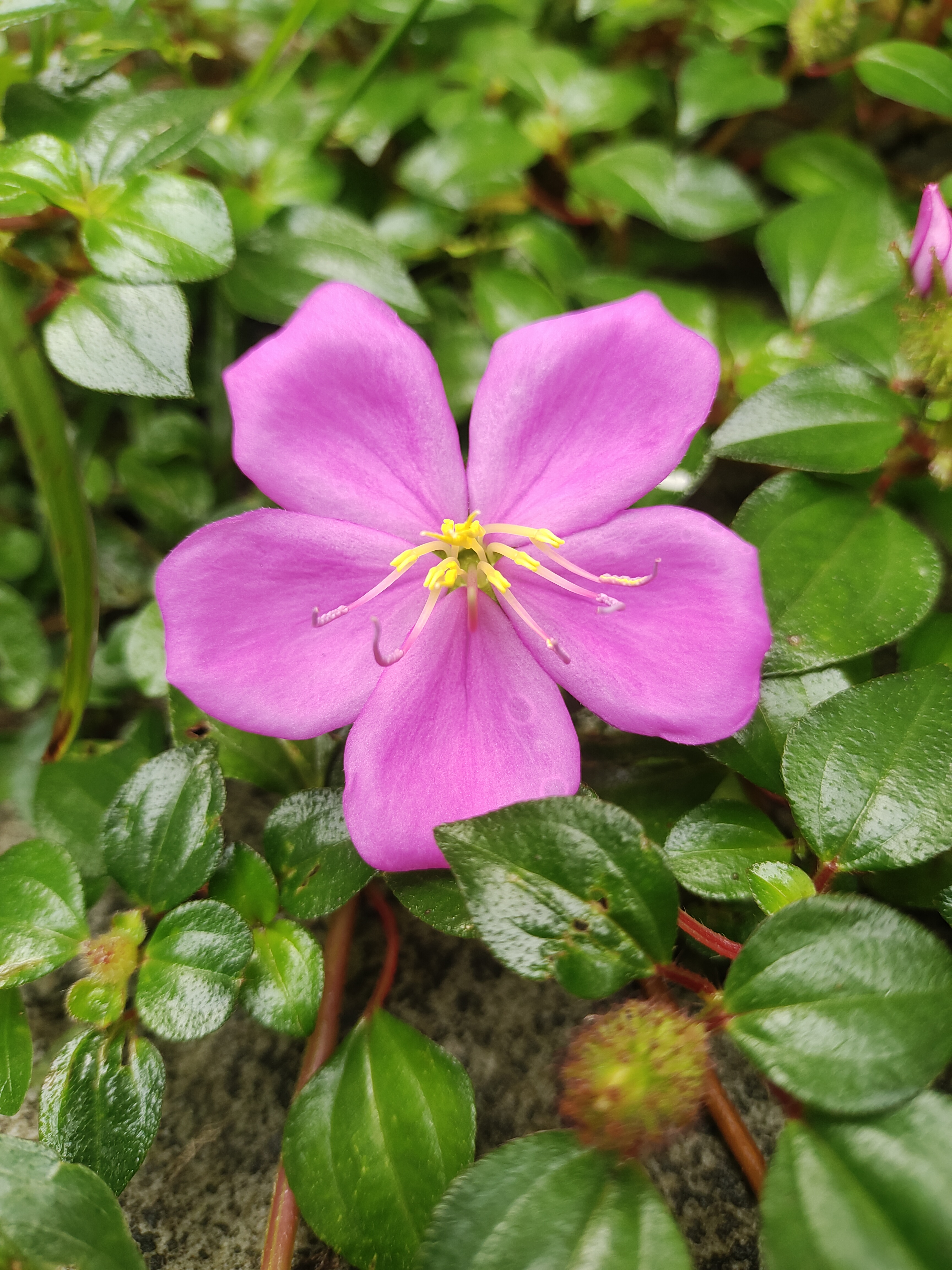 Alternative Text: Close-up view of a pink flower, highlighting its beauty and the surrounding greenery.
