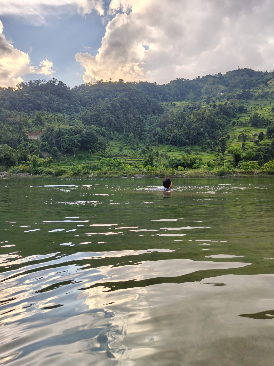 Alternative Text: A tranquil scene depicting a person swimming in a calm body of water, with green hills and a blue sky dotted with clouds in the background.