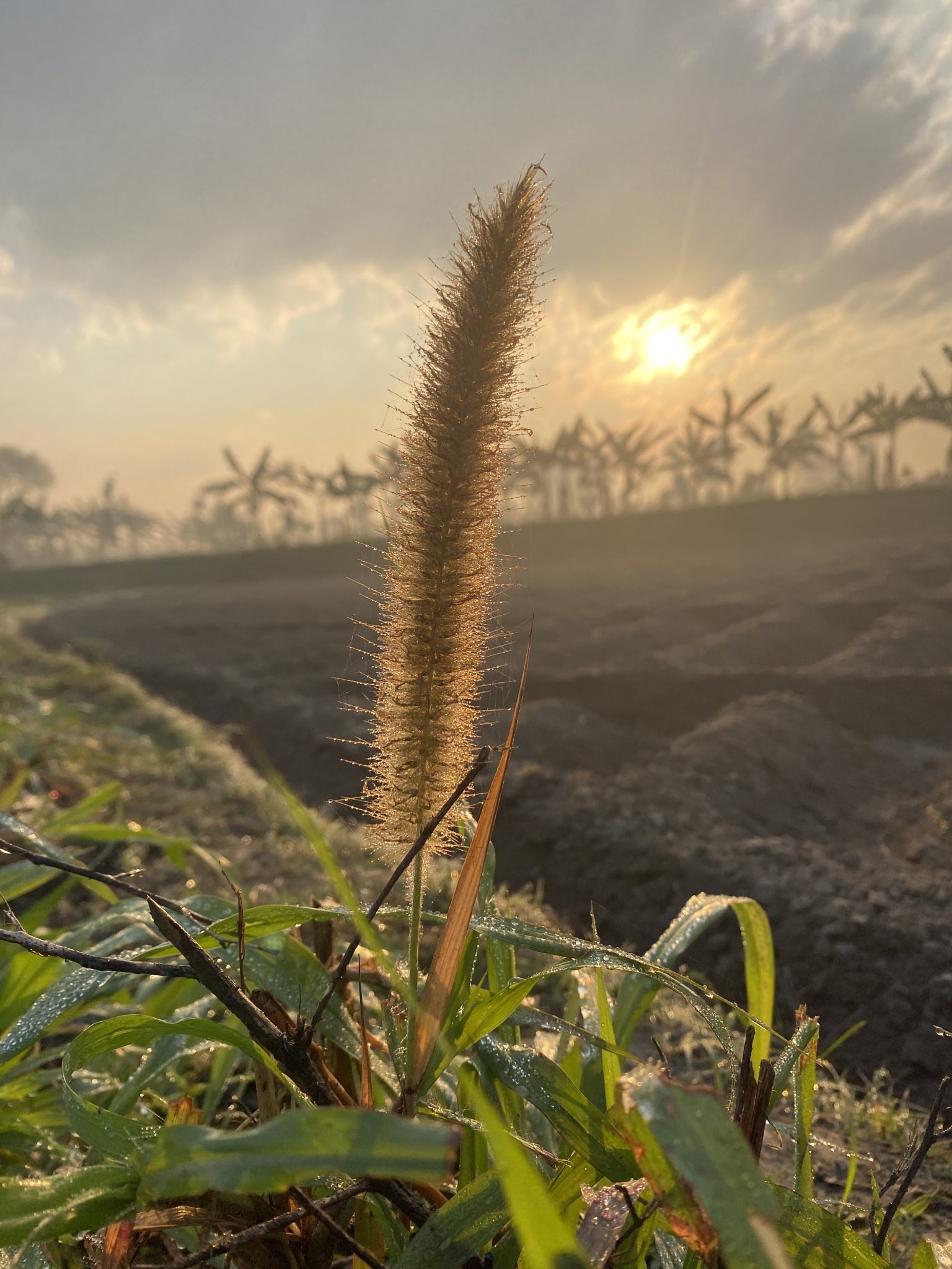 Alternative Text: A close-up of a tuft of grass with a feathery seed head in the foreground, illuminated by golden sunlight.
