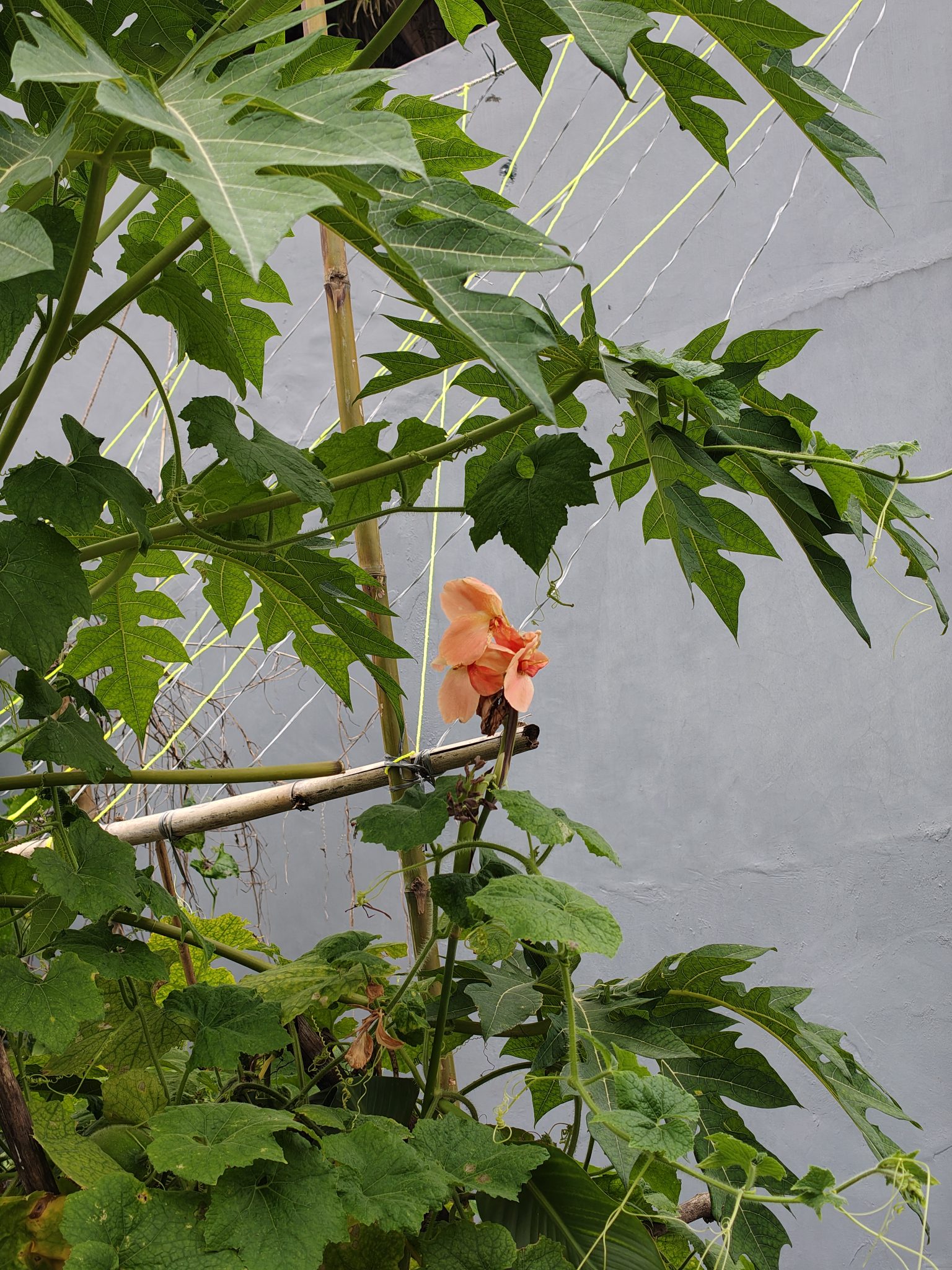 Alternative Text: A vibrant scene featuring a cluster of broad green leaves, with a delicate peach-colored flower blooming among them.