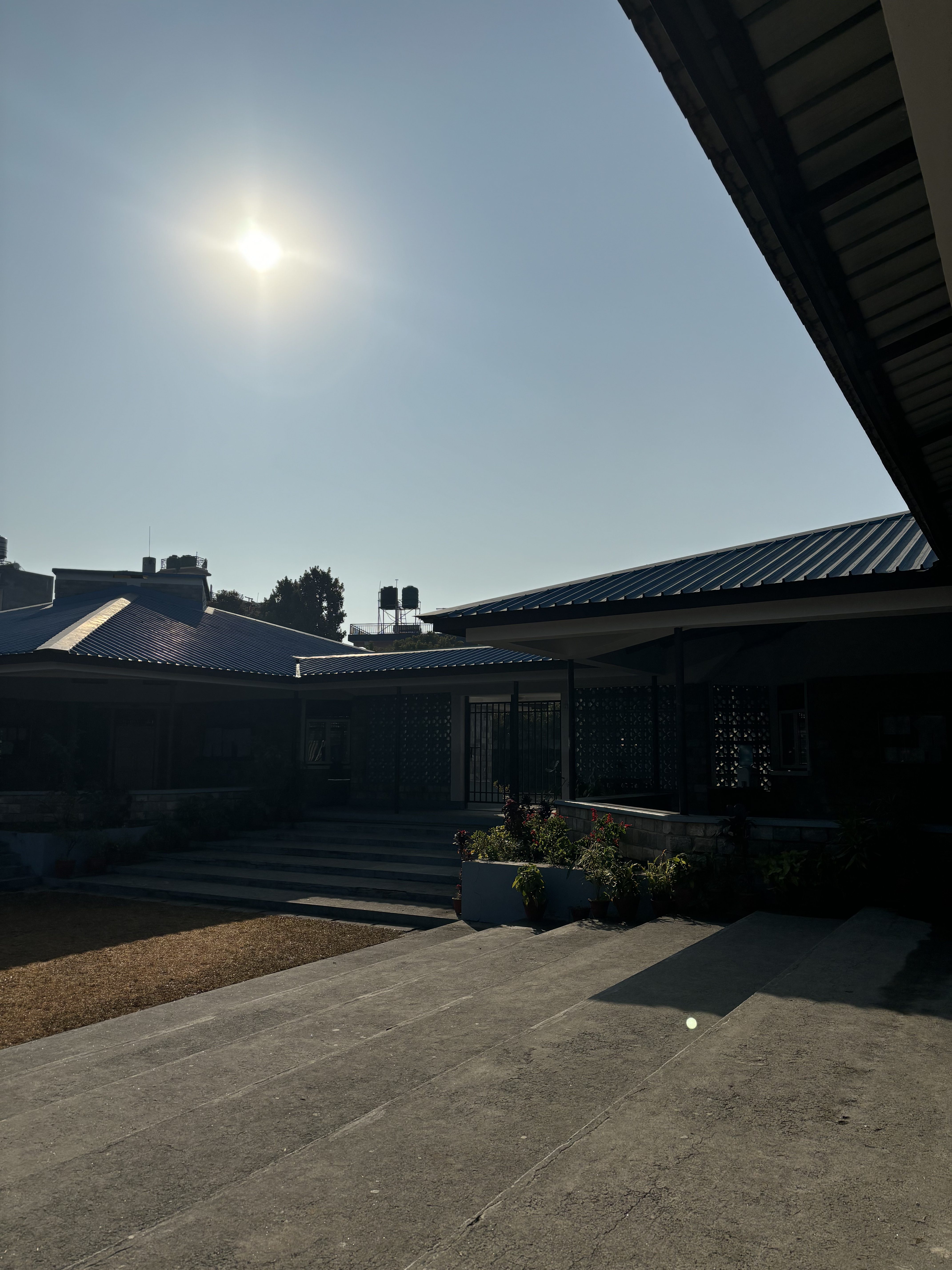 Alternative Text: A sunlit scene featuring a blue sky with the sun shining brightly. In the foreground, there is a concrete walkway leading up to a building with a modern roof.