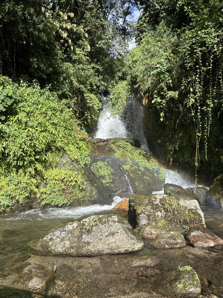 Alternative Text: A lush, green landscape featuring a small waterfall cascading over rocks into a shallow, clear stream