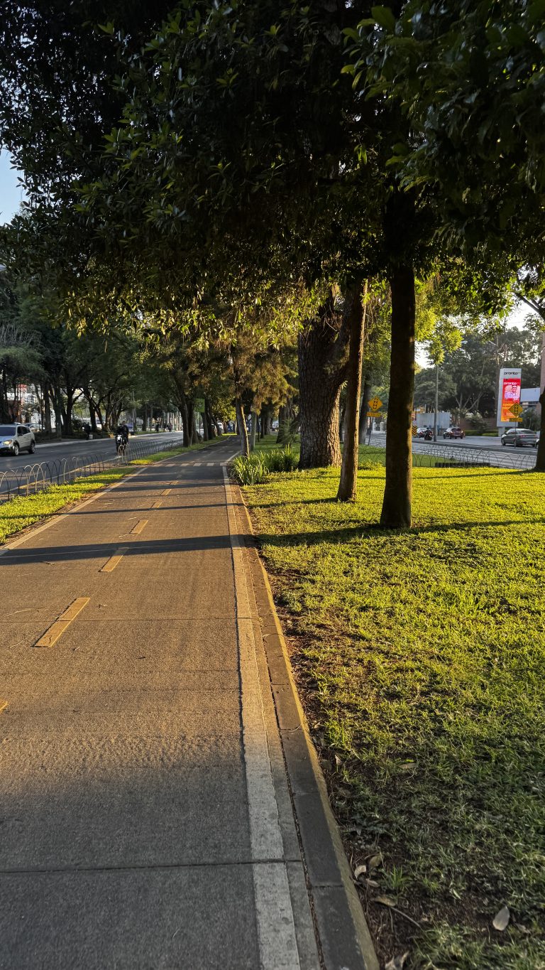 Alternative Text: A sunlit pathway lined with trees and grass, leading along a road. The path has bike lane markings, and shadows cast by the trees create a serene atmosphere.